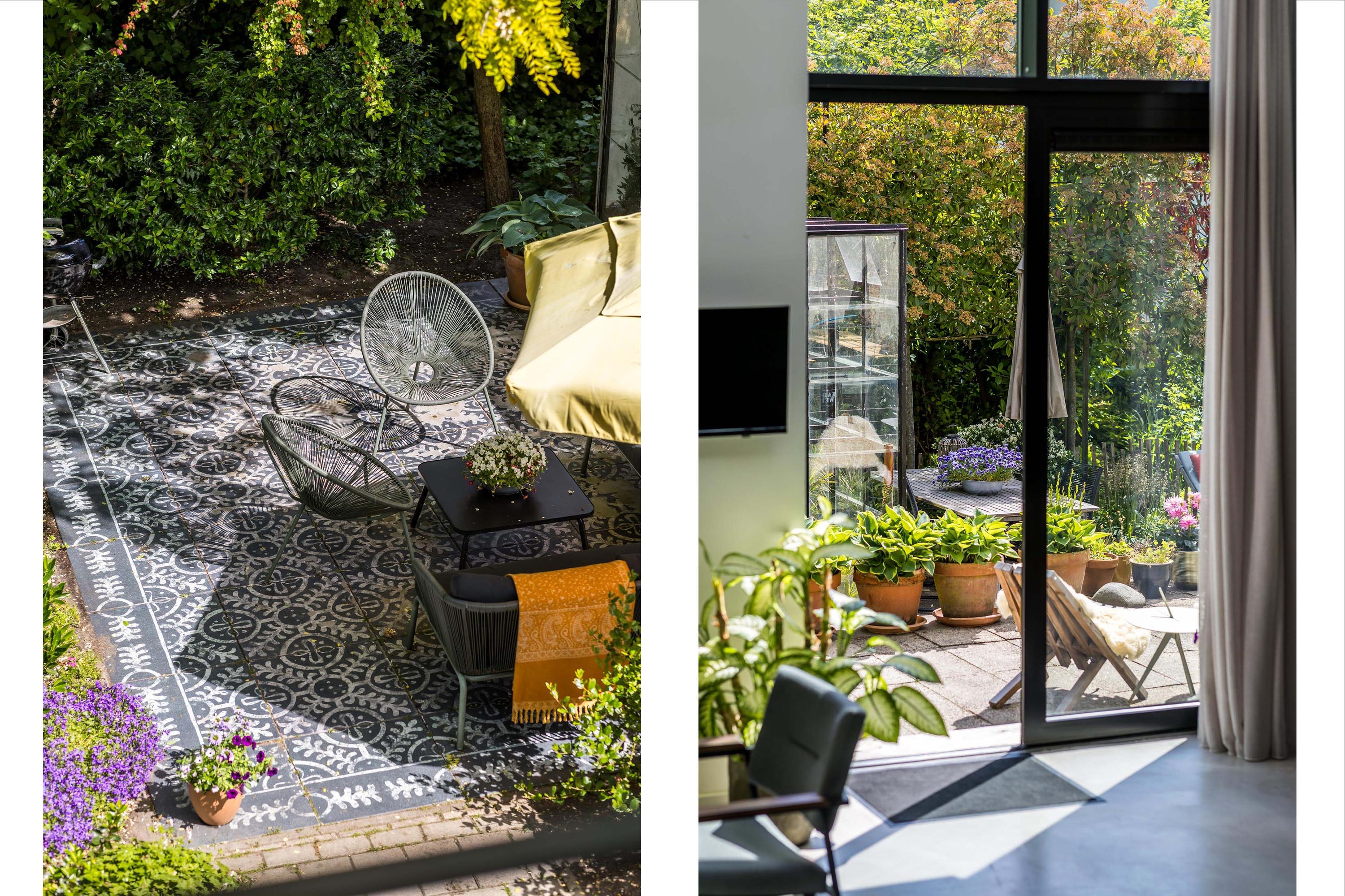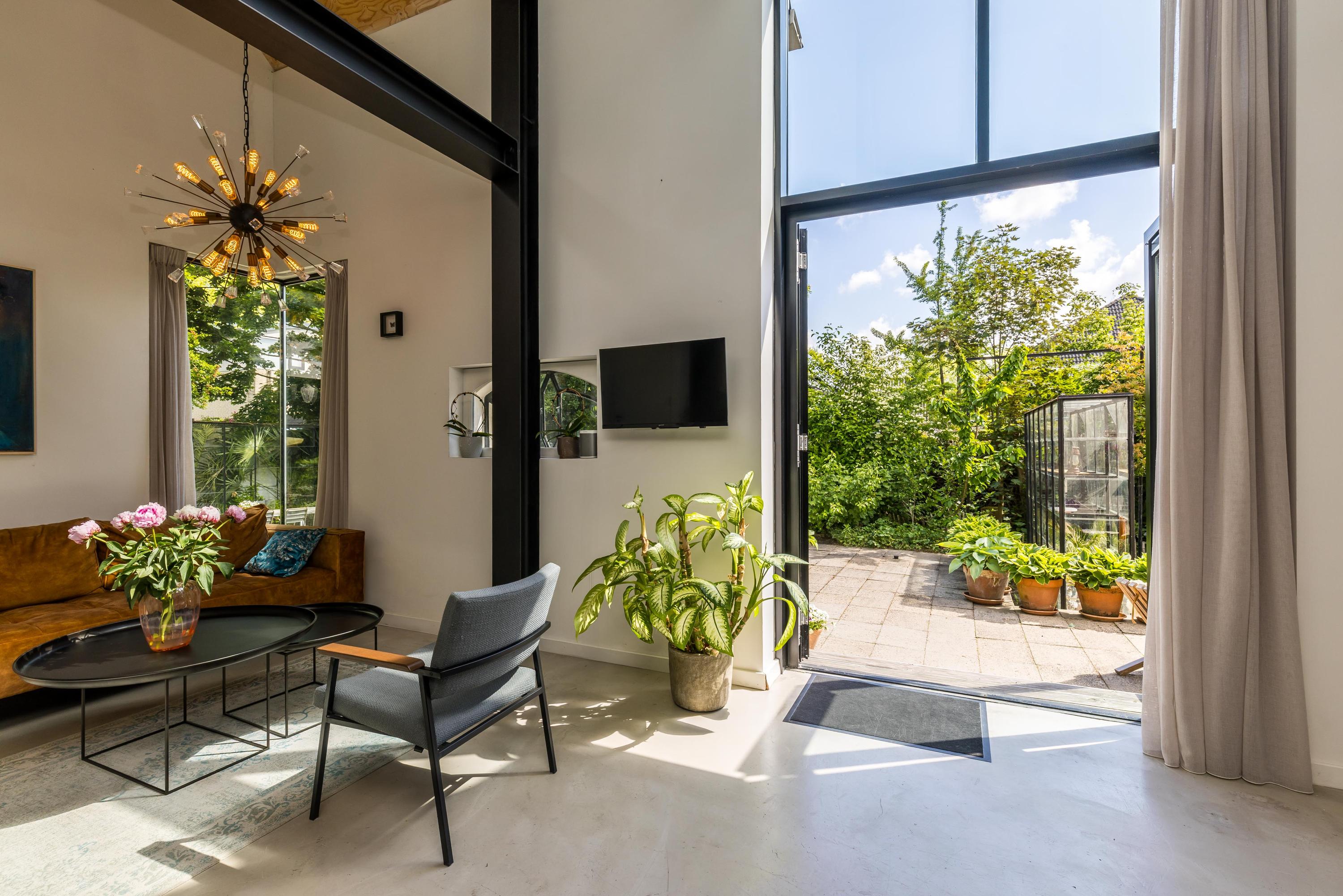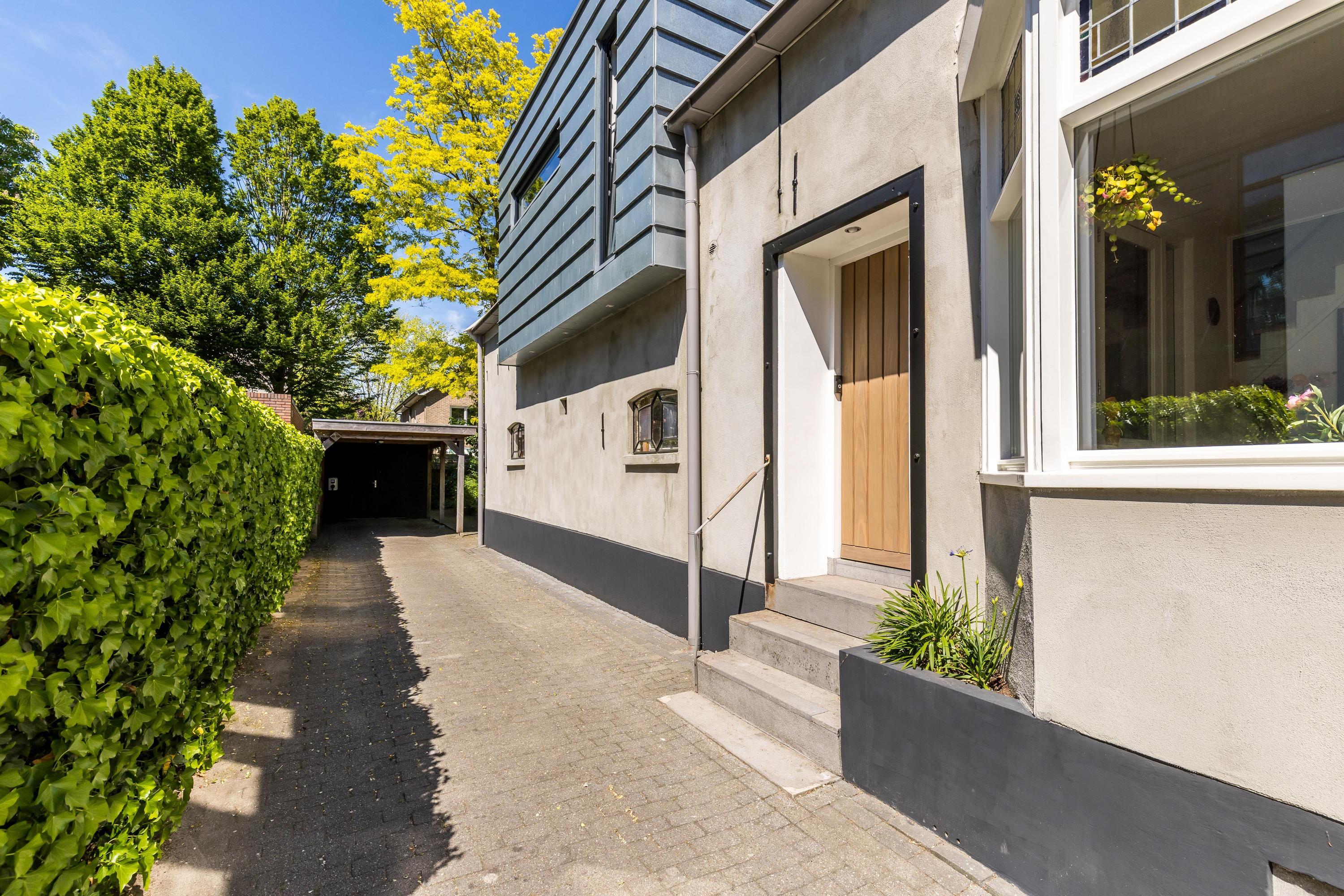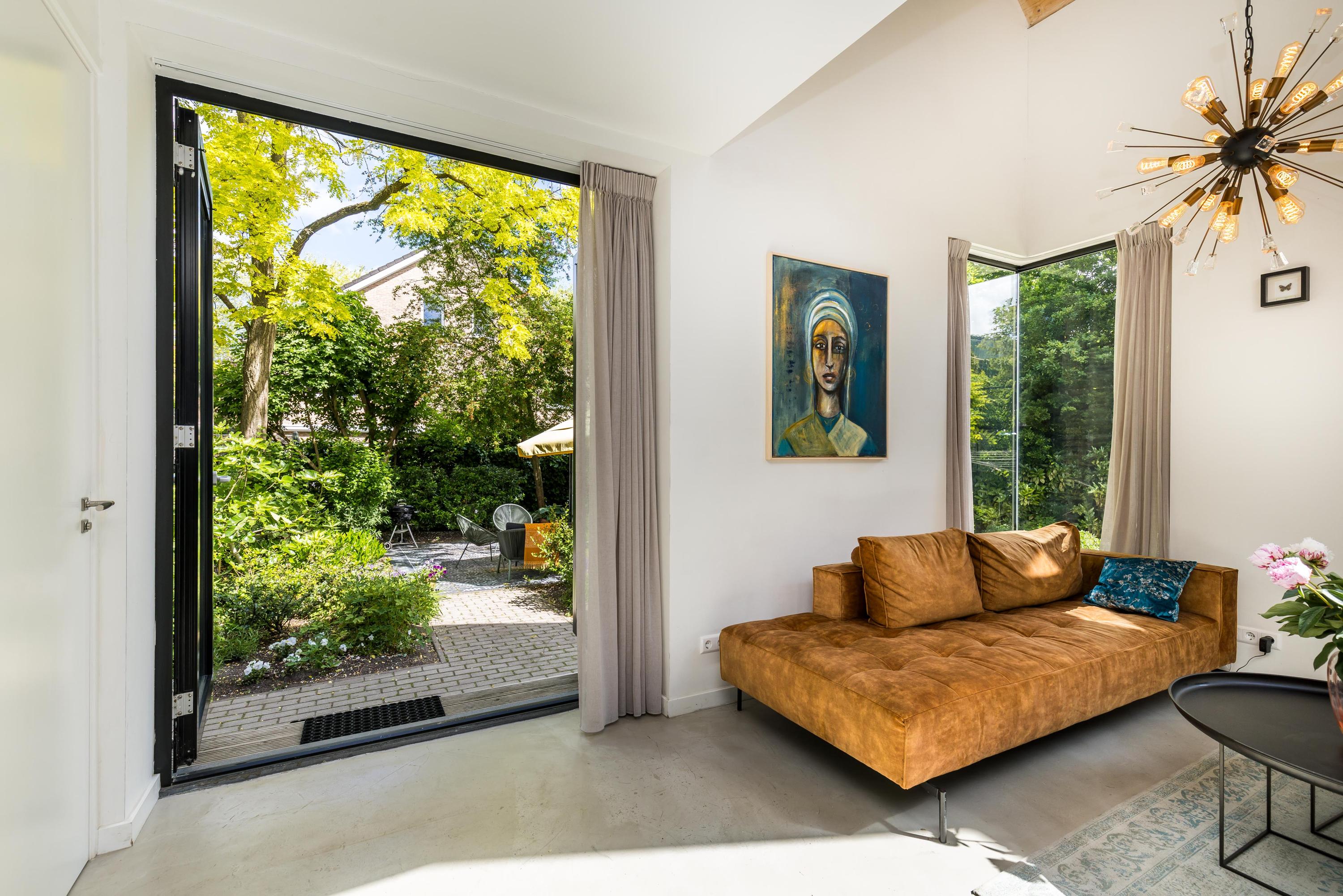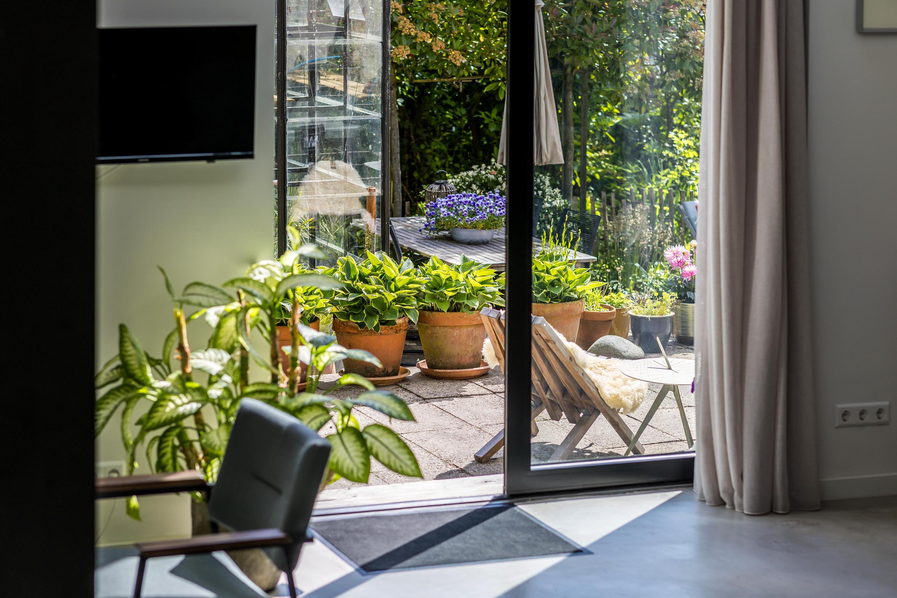 The front garden is beautifully landscaped with hedges, gravel paths and various plants. A side garden with driveway offers on-site parking, a carport with a charging station and a large storage room. The other side garden and the backyard together form a beautiful main garden area. At the back of the garden is a food forest with fruit trees, herbs and soft fruit. This garden has been landscaped under architecture and offers a lot of privacy and various sunny seating areas.