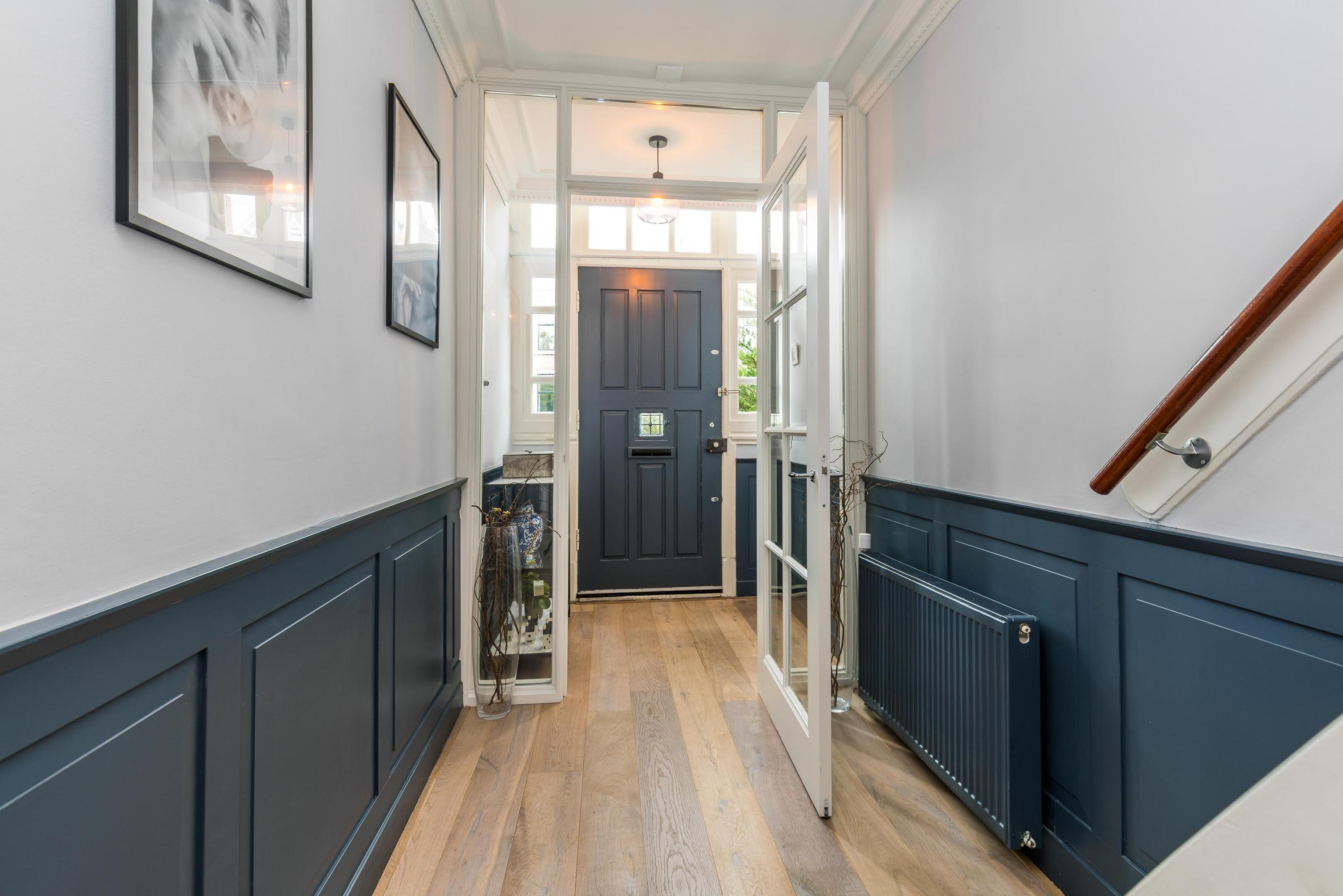 Representative entrance with high ceilings and original details. From the hallway, access to the modern guest toilet and the spacious living area with a beautiful oak floor. The open kitchen (renovated in 2022) forms the heart of the home and is equipped with a large cooking island, high-end built-in appliances including a steam oven and a (wine) climate cabinet. Adjacent is the bright conservatory with French doors opening onto the sunny rear garden, where indoor and outdoor living blend seamlessly.