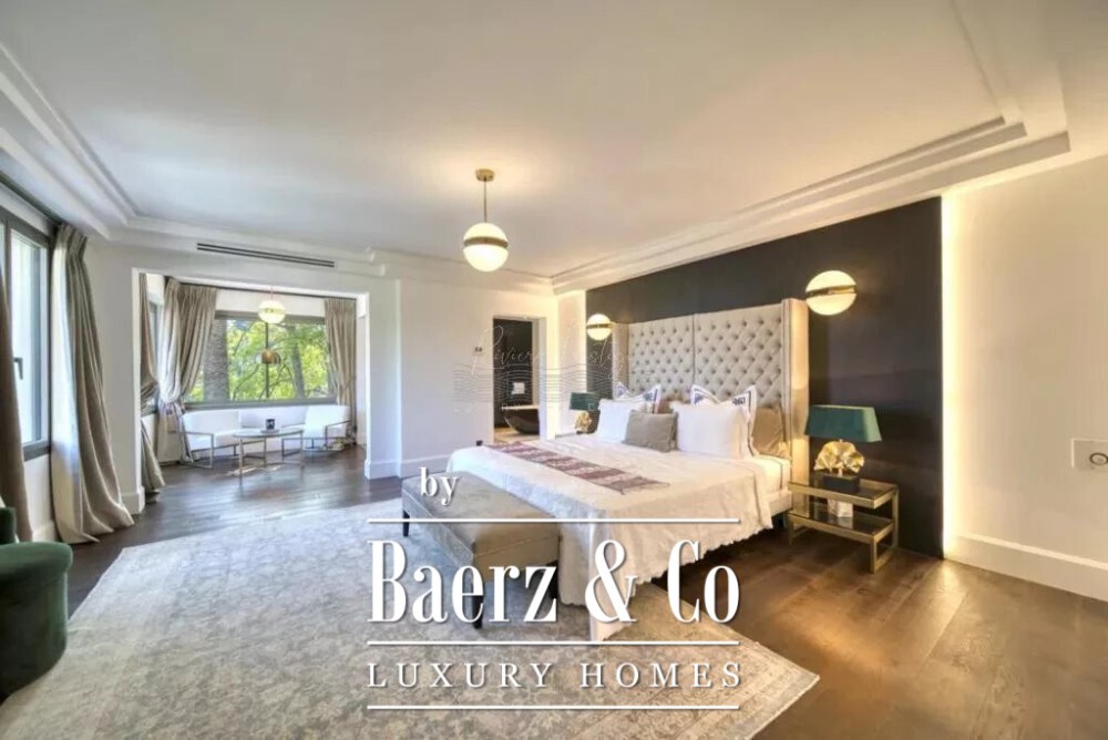 Inside, six en-suite bedrooms include two master suites. A vast reception area is shaped by natural light and anchored by a fireplace, with living and dining spaces unfolding seamlessly into a professional open kitchen, utility rooms, and a winter garden hosting a library area. Behind a concealed swivel bookcase, the lounge bar doubles as a safe room, complete with a private shower room. Dedicated spaces for wellness include dual massage rooms, a yoga area, fitness suite, hammam, sauna, and both indoor and outdoor swimming pools.