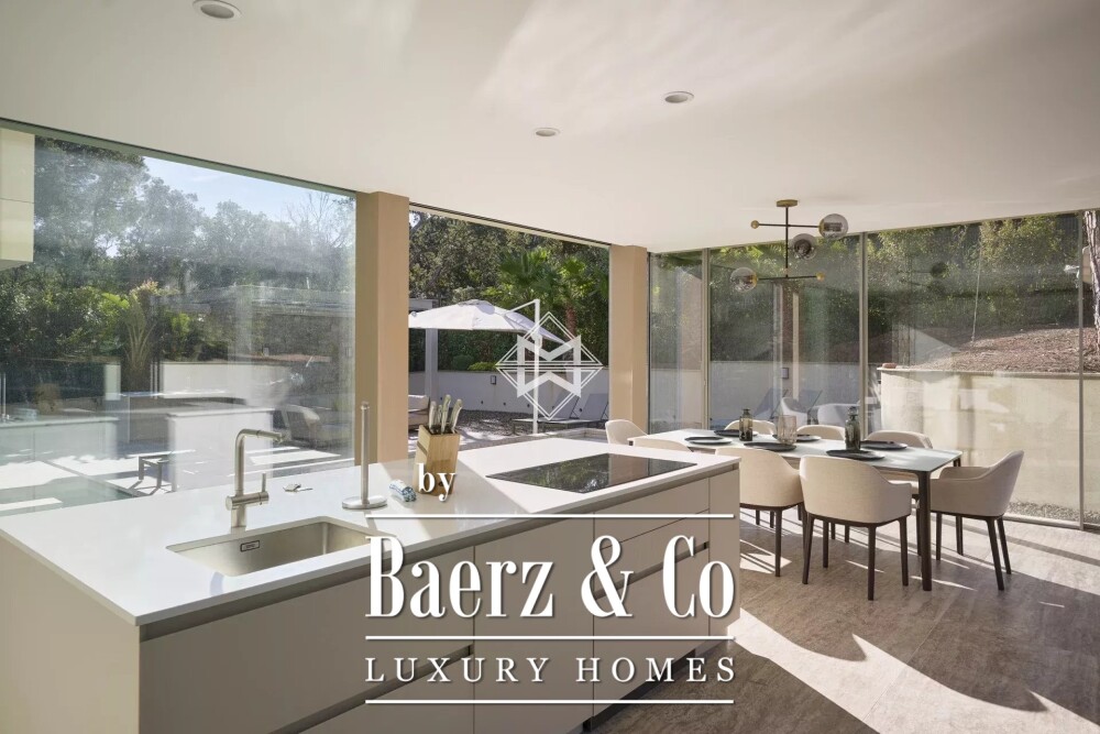 The architecture harmonises openness and discretion, with large windows framing sea and garden views while a series of subtle finishes ensure calm and security. Features such as air-conditioning, double glazing, fireplace, and modern safety technology—including video security, an alarm system, and electric gates—blend seamlessly into the daily rhythm. Outdoors, a swimming pool, irrigation system, and barbecue area invite restful afternoons, while the fitness suite and sauna add refinement to daily life.