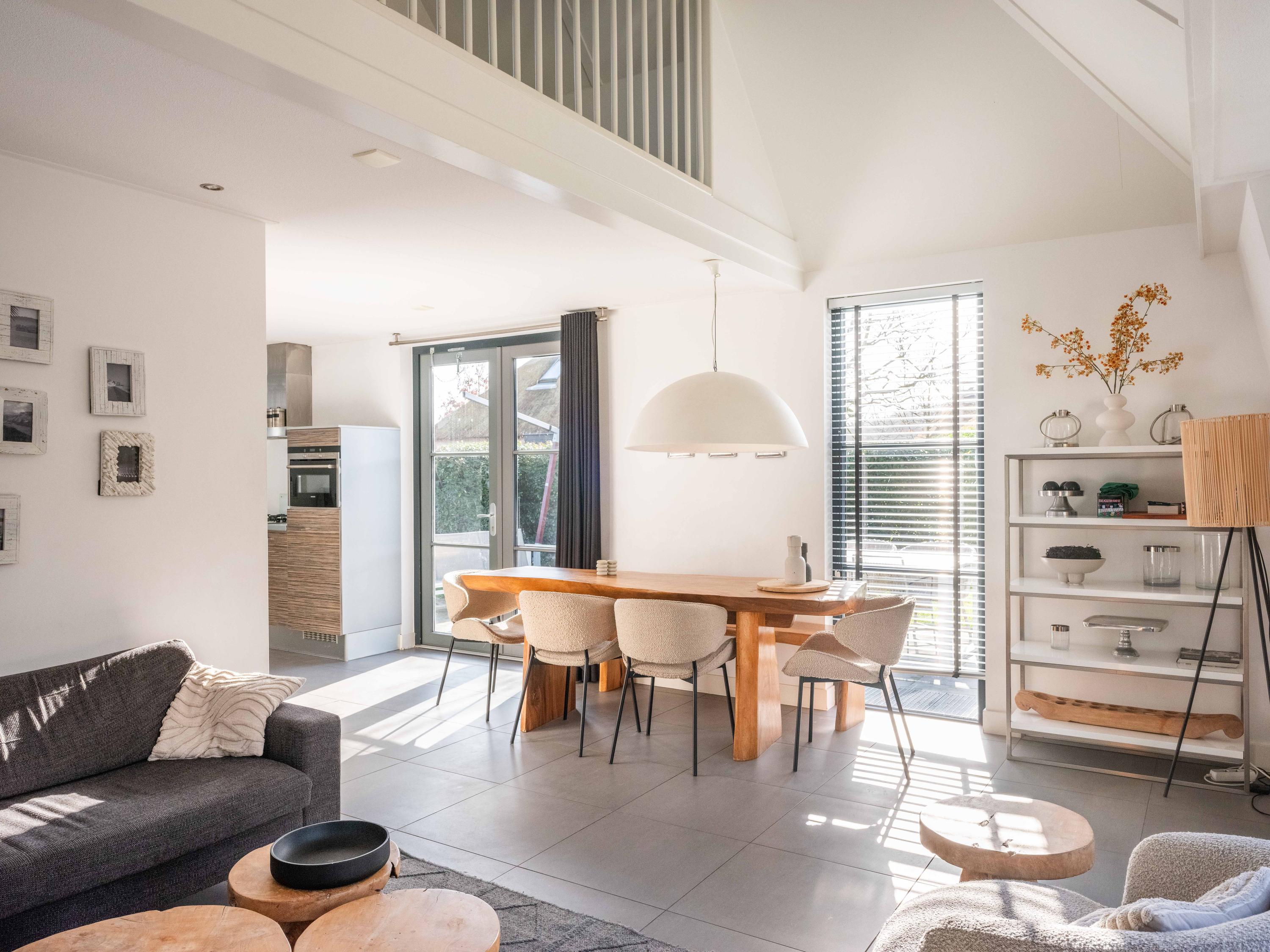 De lichte woonkamer met open keuken is ruim opgezet en biedt zowel een eetgedeelte als een zithoek met een sfeervolle gashaard. De keuken is uitgerust met o.a. een 4-pits gasfornuis, een vaatwasser, een combimagnetron en een afzuigkap. Vanuit de woonkamer leiden openslaande deuren naar de tuin en het terras. Zowel de begane grond als de kelder zijn voorzien van vloerverwarming en er ligt een plavuizen vloer.