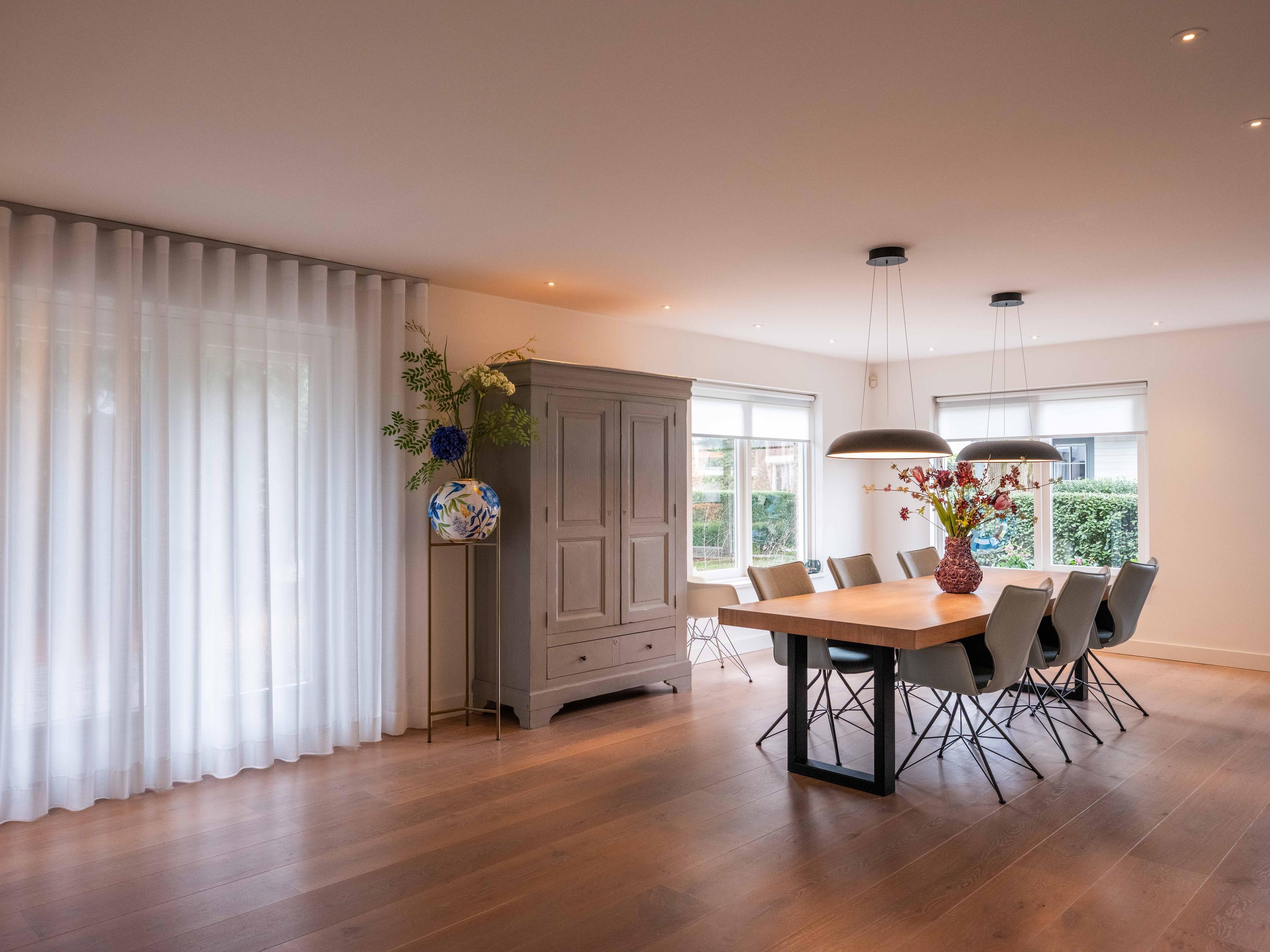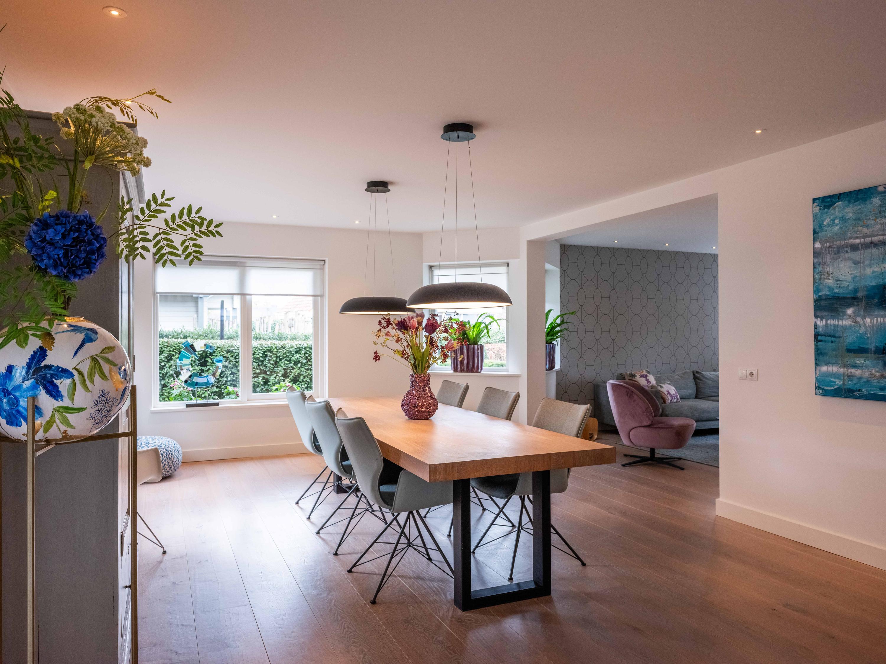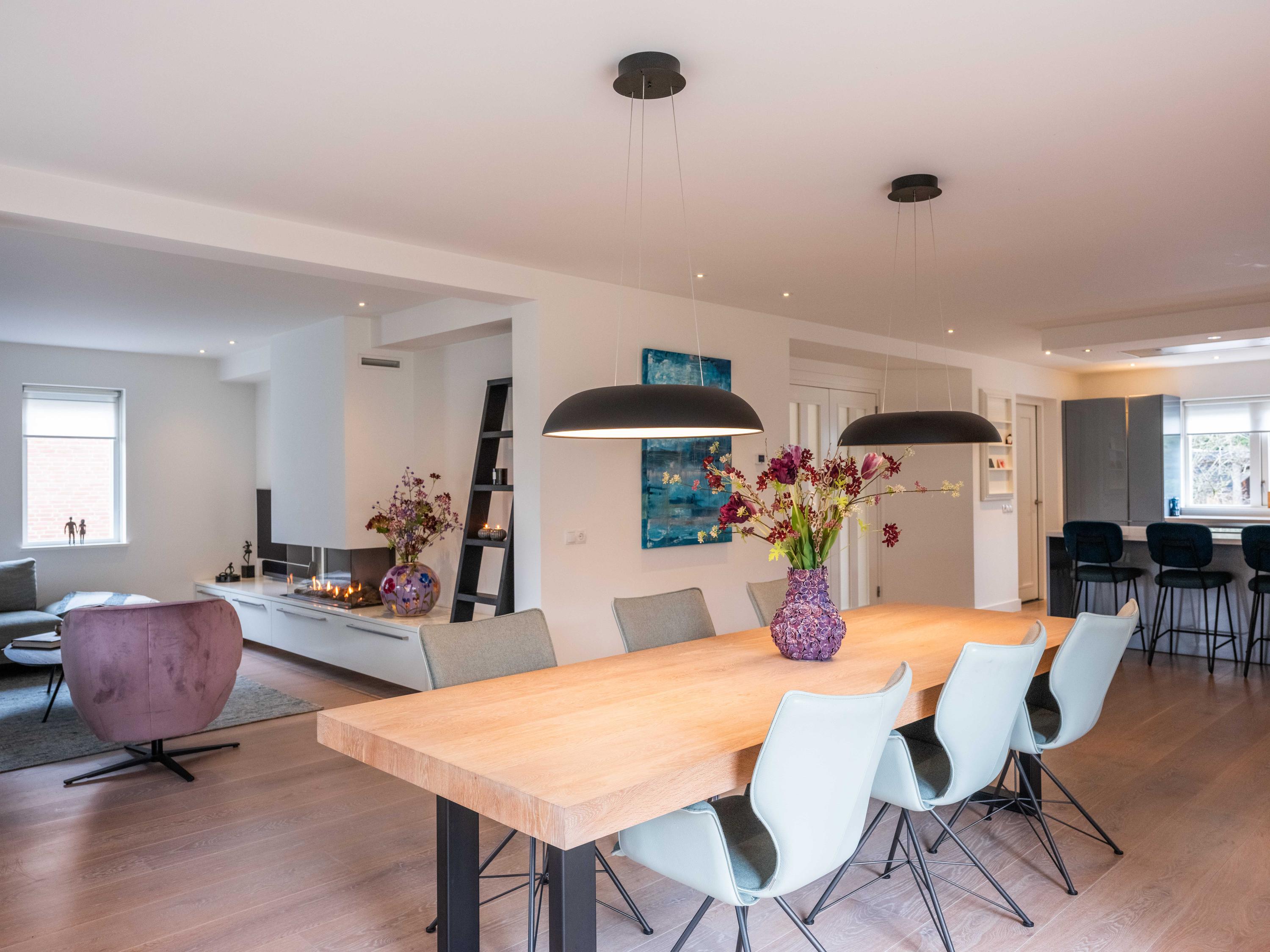 Double doors give access to the spacious L-shaped living room, where you are immediately welcomed by lots of light thanks to the large windows. In the corner is a cosy sitting area with an attractive gas fireplace. The oak laminate flooring in combination with underfloor heating throughout the ground floor creates a warm and comfortable atmosphere.