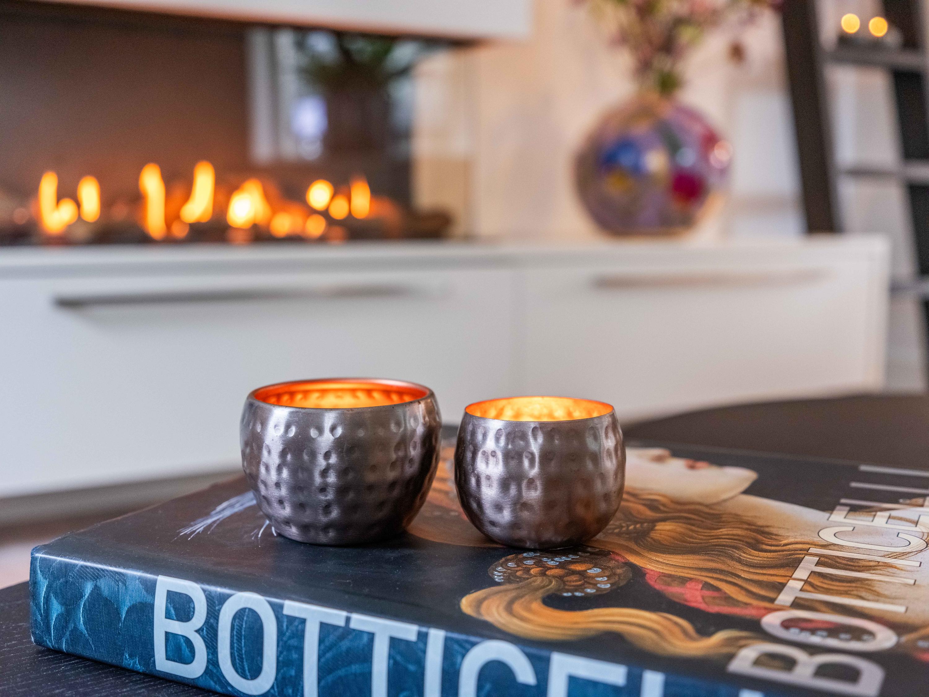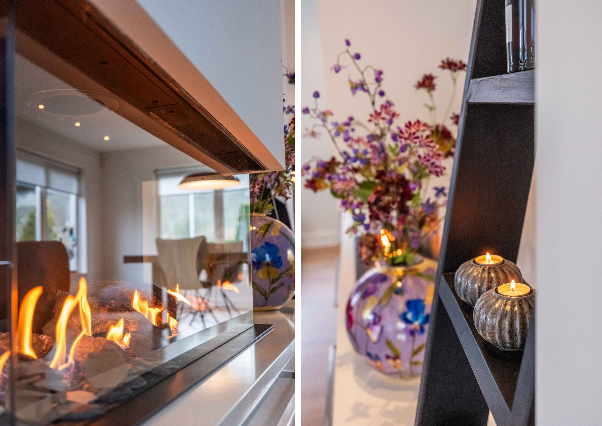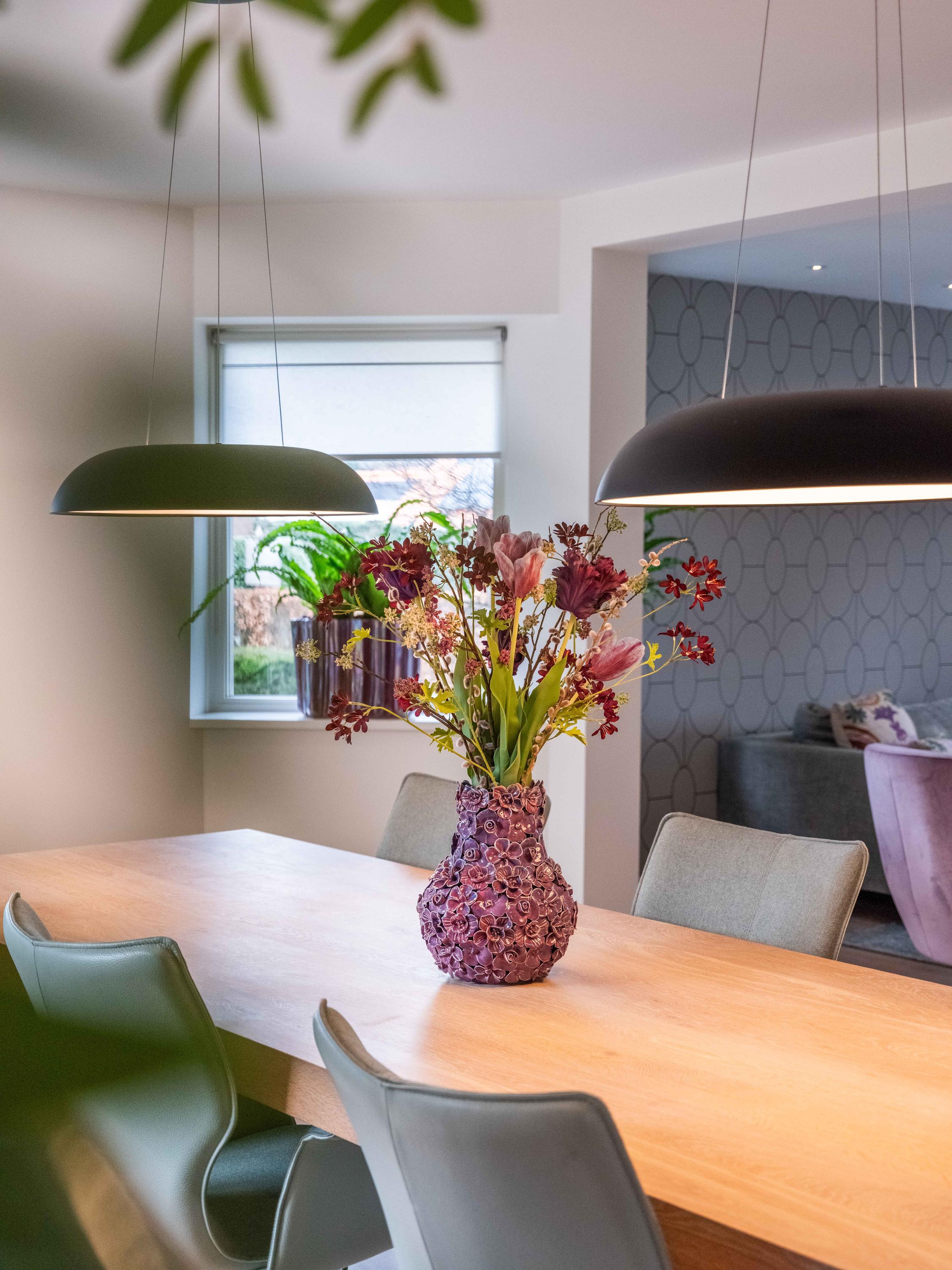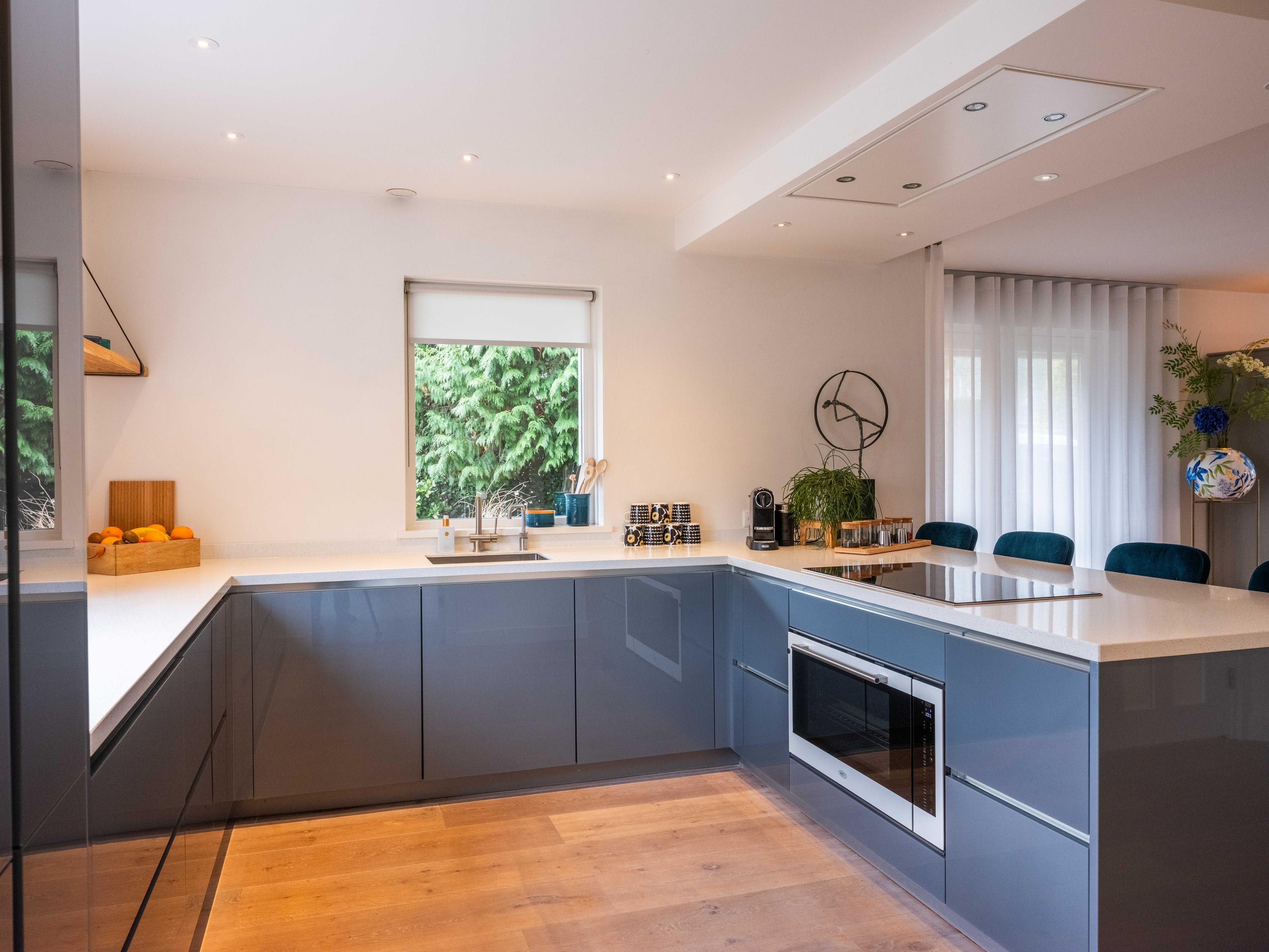 Double doors give access to the spacious L-shaped living room, where you are immediately welcomed by lots of light thanks to the large windows. In the corner is a cosy sitting area with an attractive gas fireplace. The oak laminate flooring in combination with underfloor heating throughout the ground floor creates a warm and comfortable atmosphere.