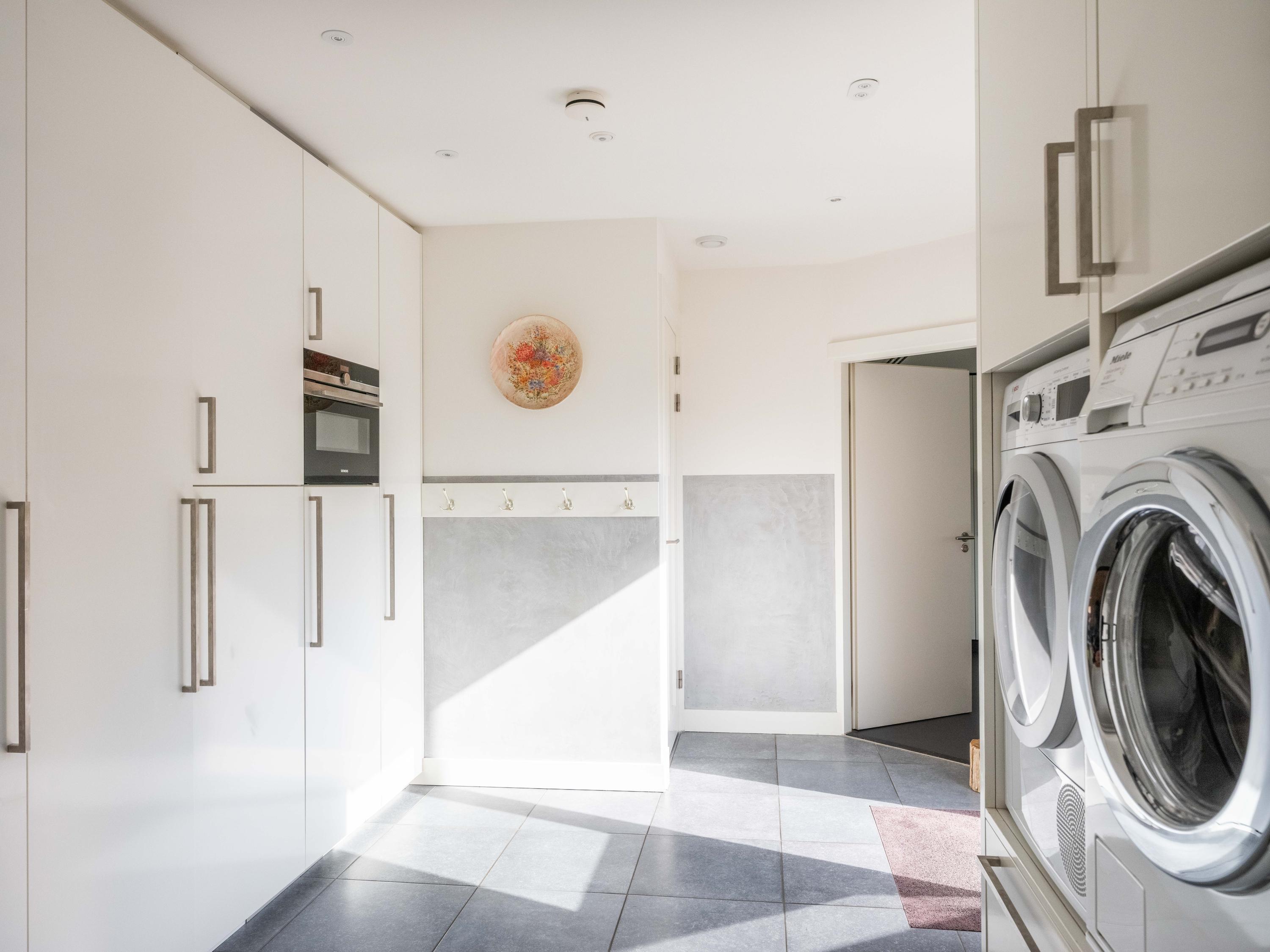 Adjacent to the kitchen is the spacious utility room with built-in cupboards and connections for a washing machine and dryer. The utility room also has an additional toilet and a door to the garden and terrace.