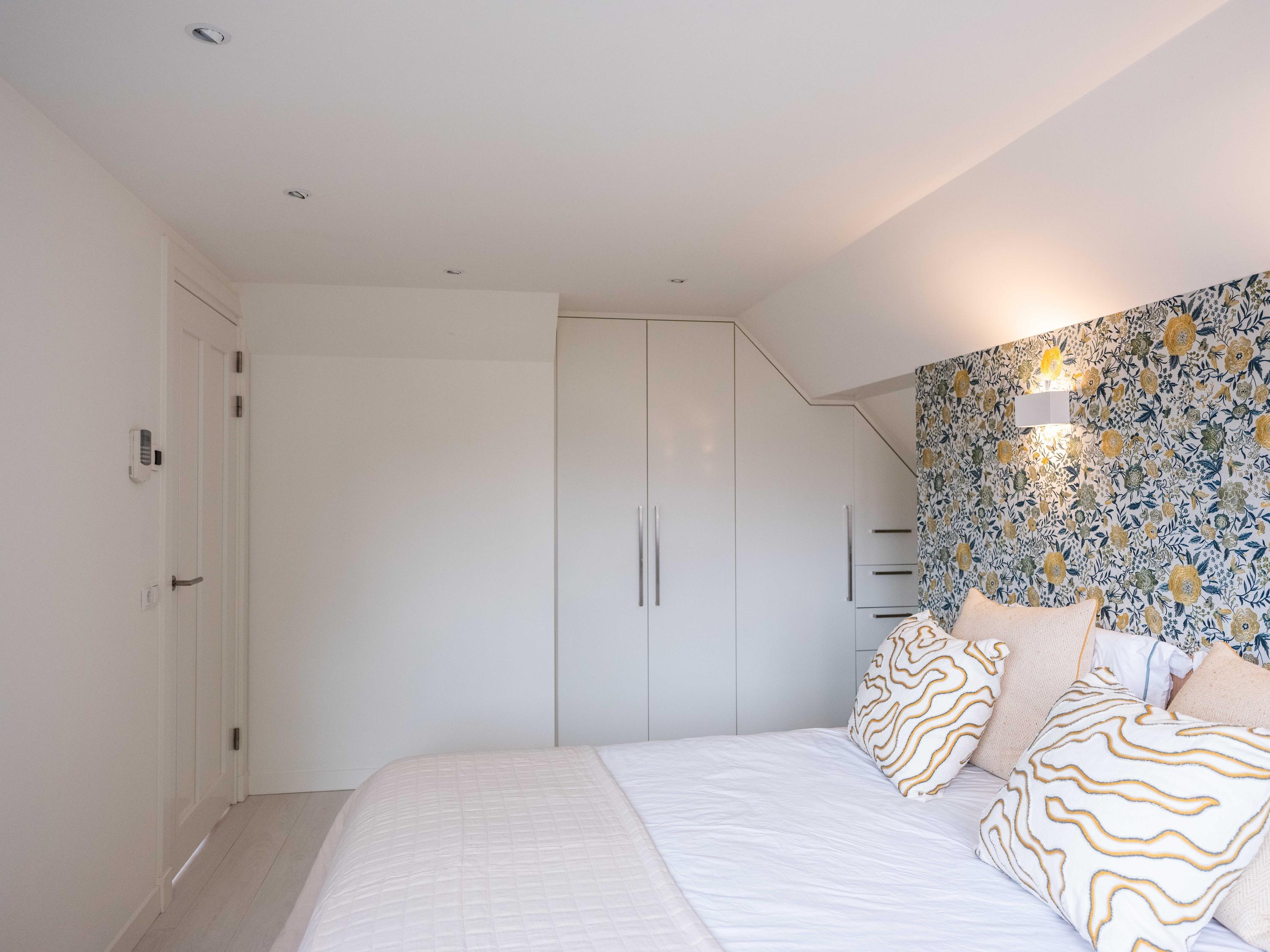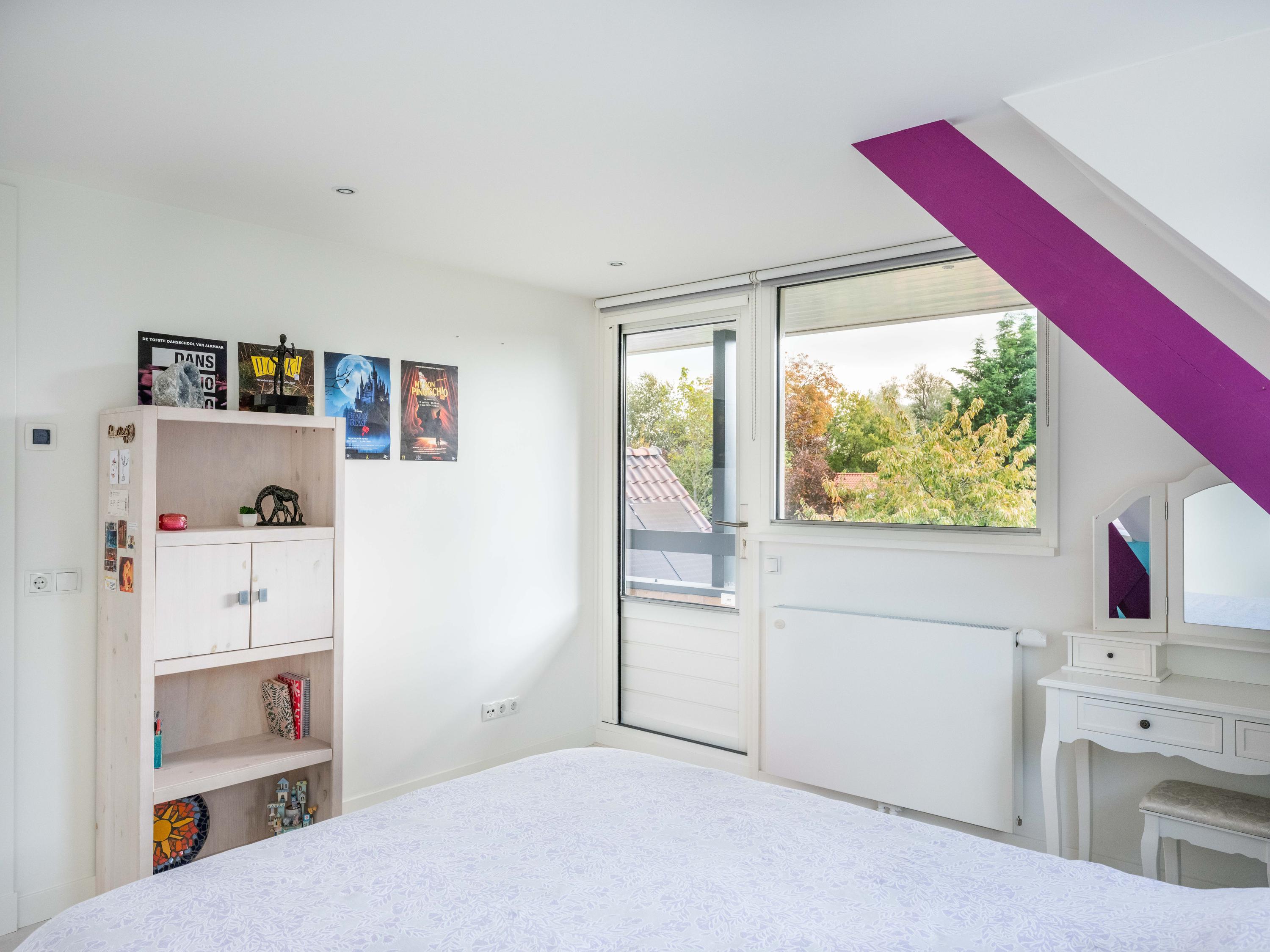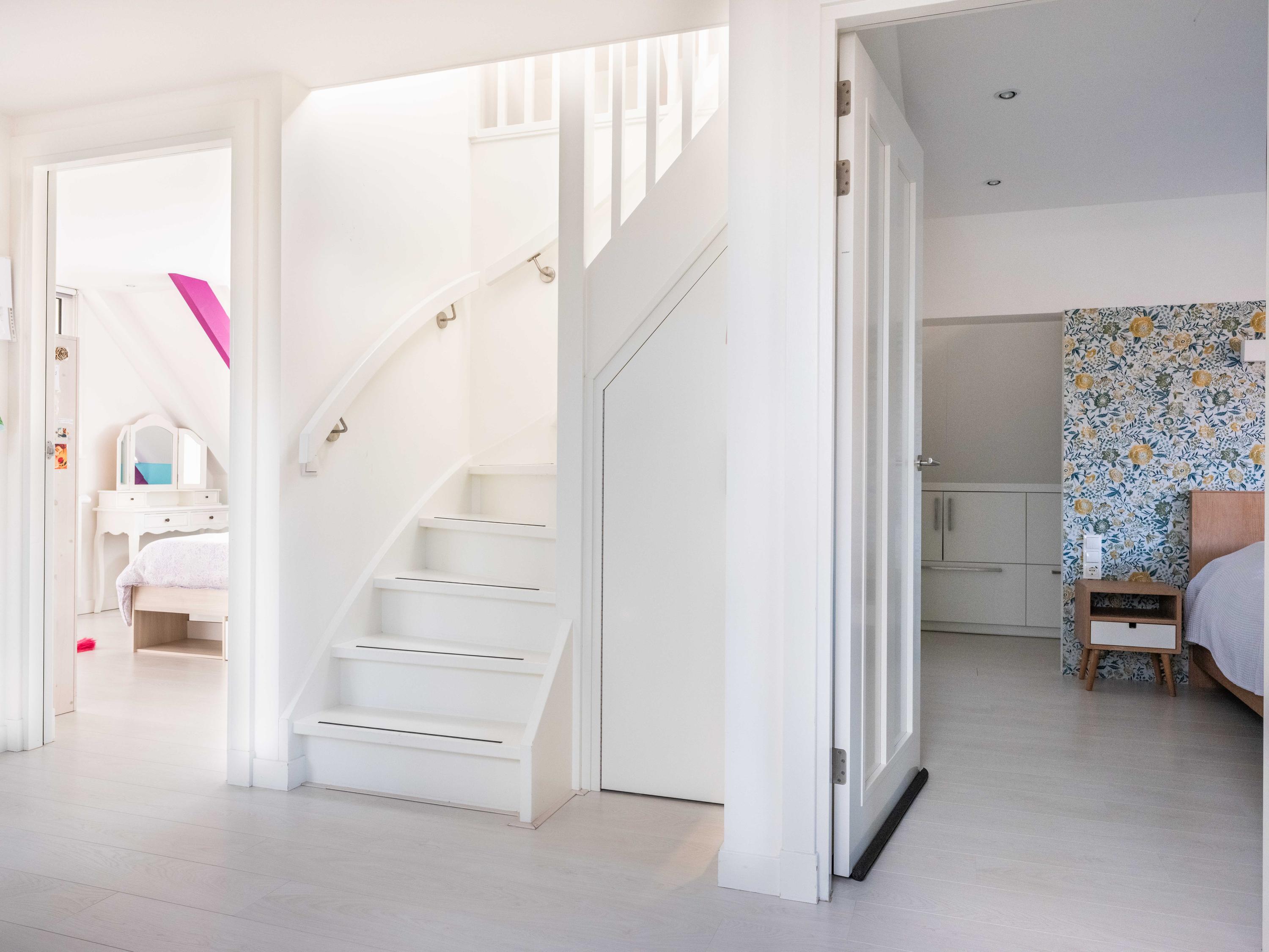 On the first floor, there are three bedrooms and a spacious bathroom with double sink, toilet, bathtub and a generous double walk-in shower. Underfloor heating is also present here, as well as a radiator. The master bedroom is spacious and has plenty of built-in cupboard space. There are two additional bright bedrooms, both with built-in cupboards and access to a private balcony. There is a handy storage cupboard under the stairs to the attic.
