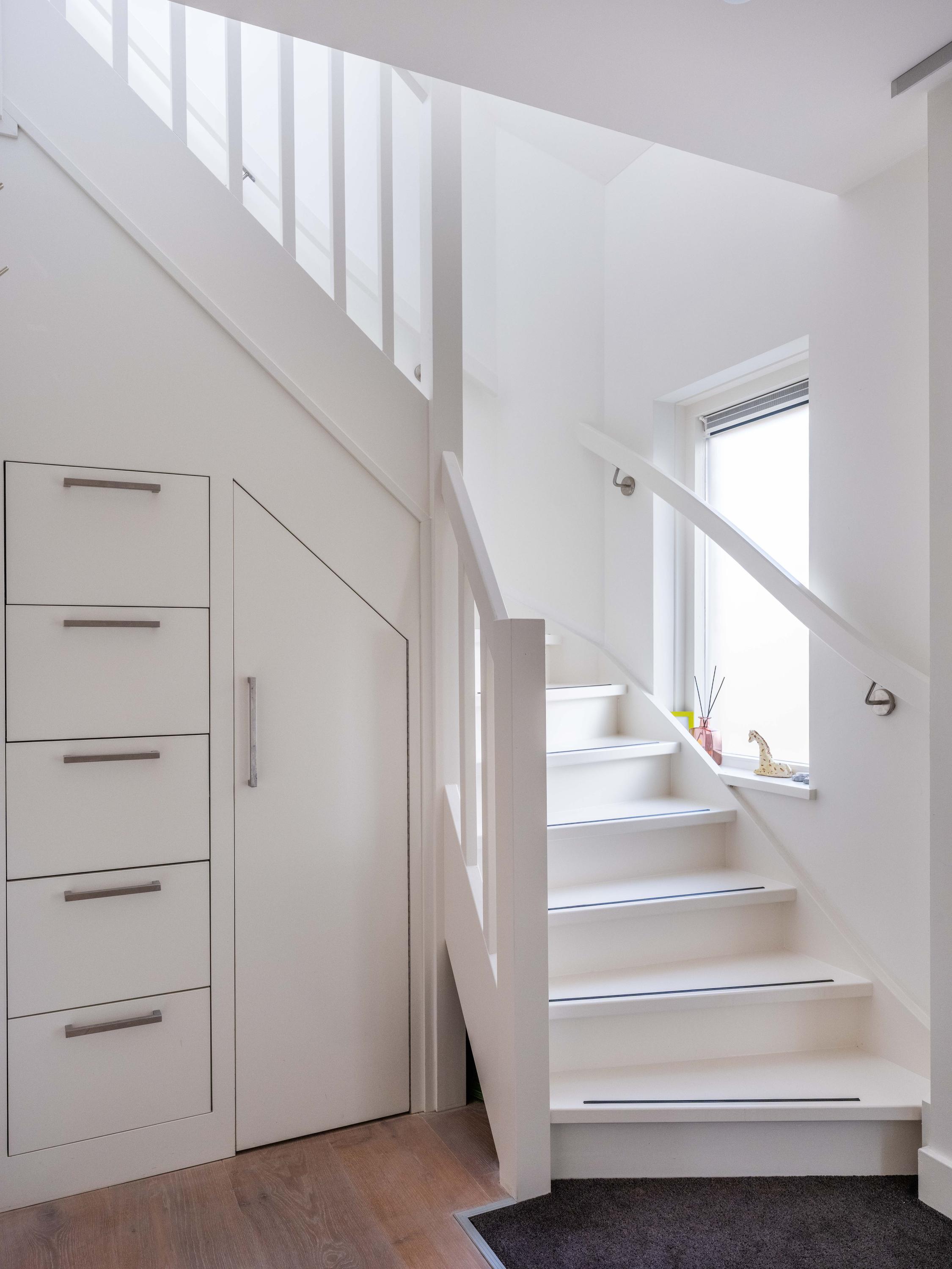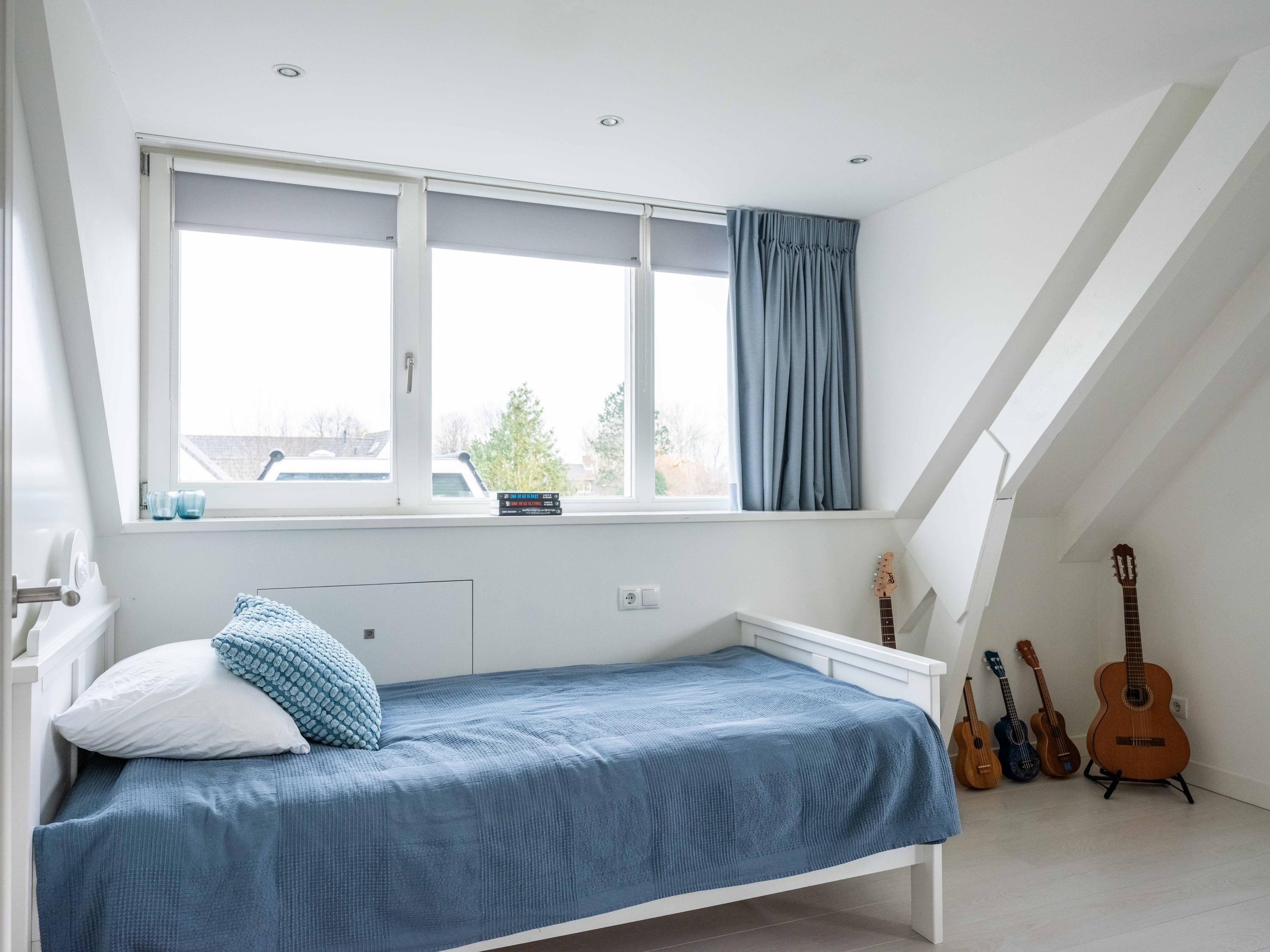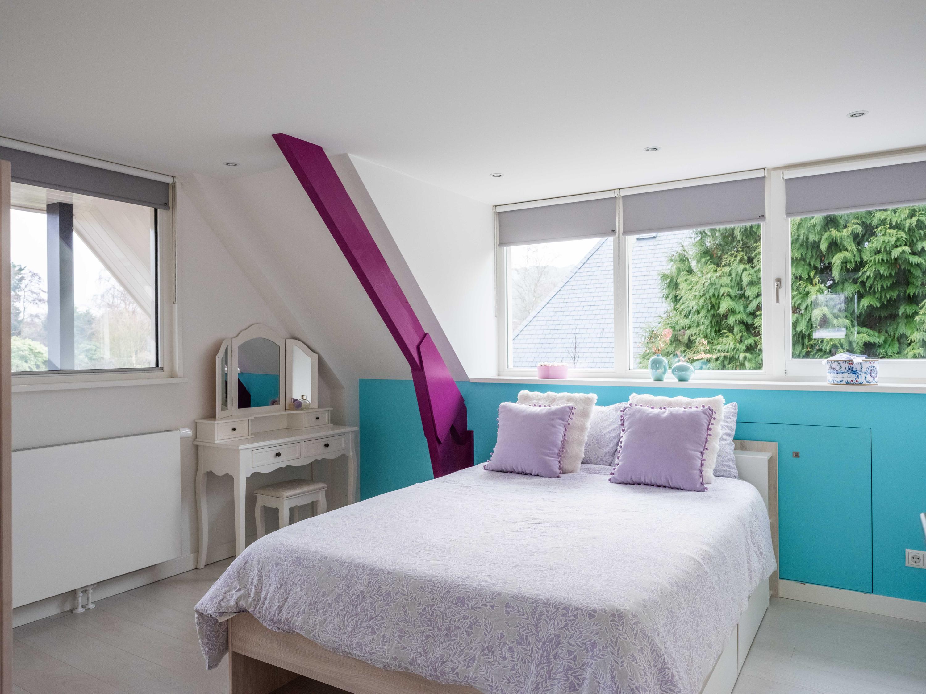 On the first floor, there are three bedrooms and a spacious bathroom with double sink, toilet, bathtub and a generous double walk-in shower. Underfloor heating is also present here, as well as a radiator. The master bedroom is spacious and has plenty of built-in cupboard space. There are two additional bright bedrooms, both with built-in cupboards and access to a private balcony. There is a handy storage cupboard under the stairs to the attic.