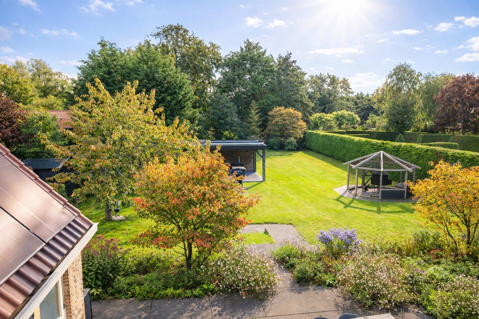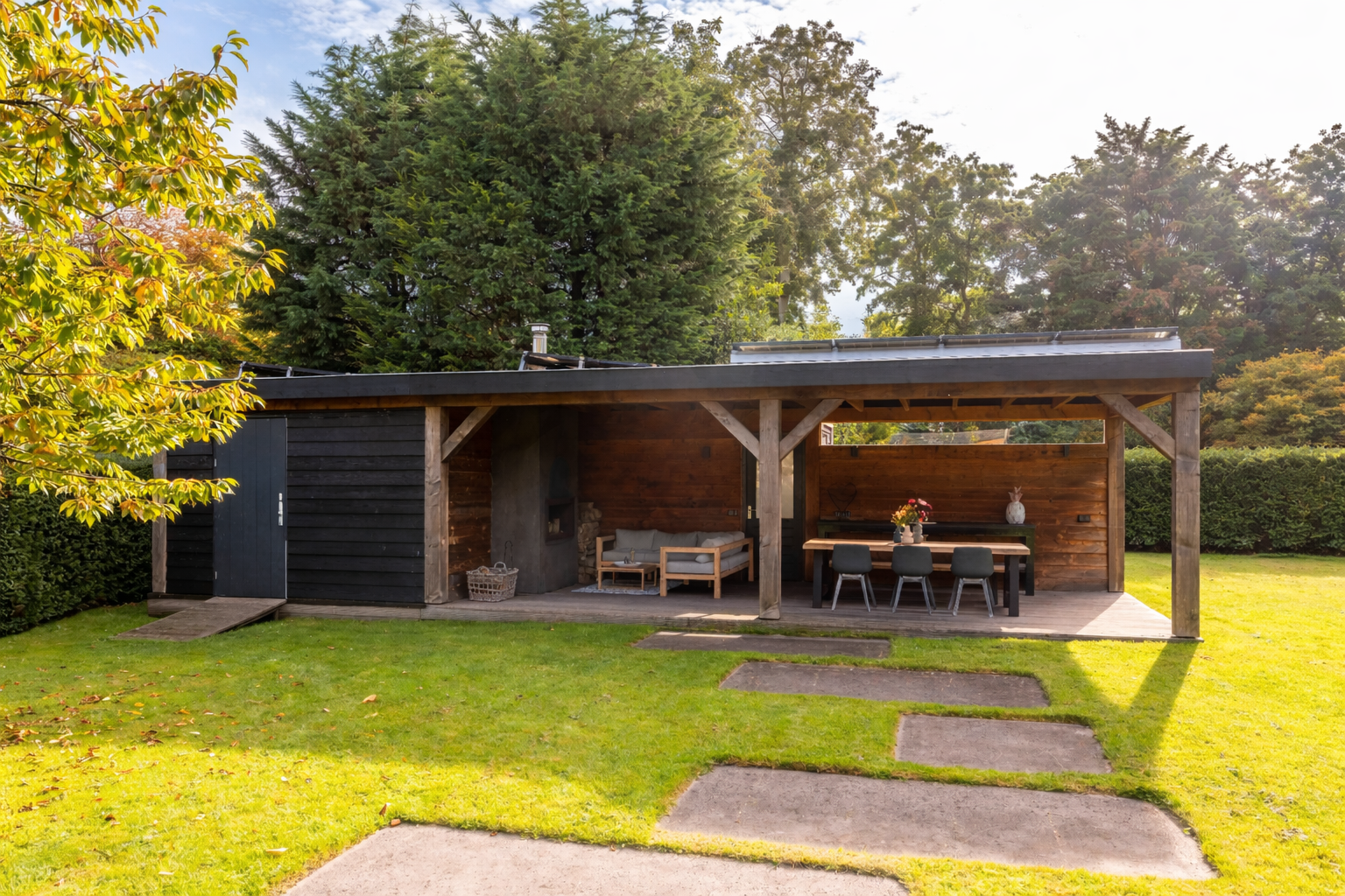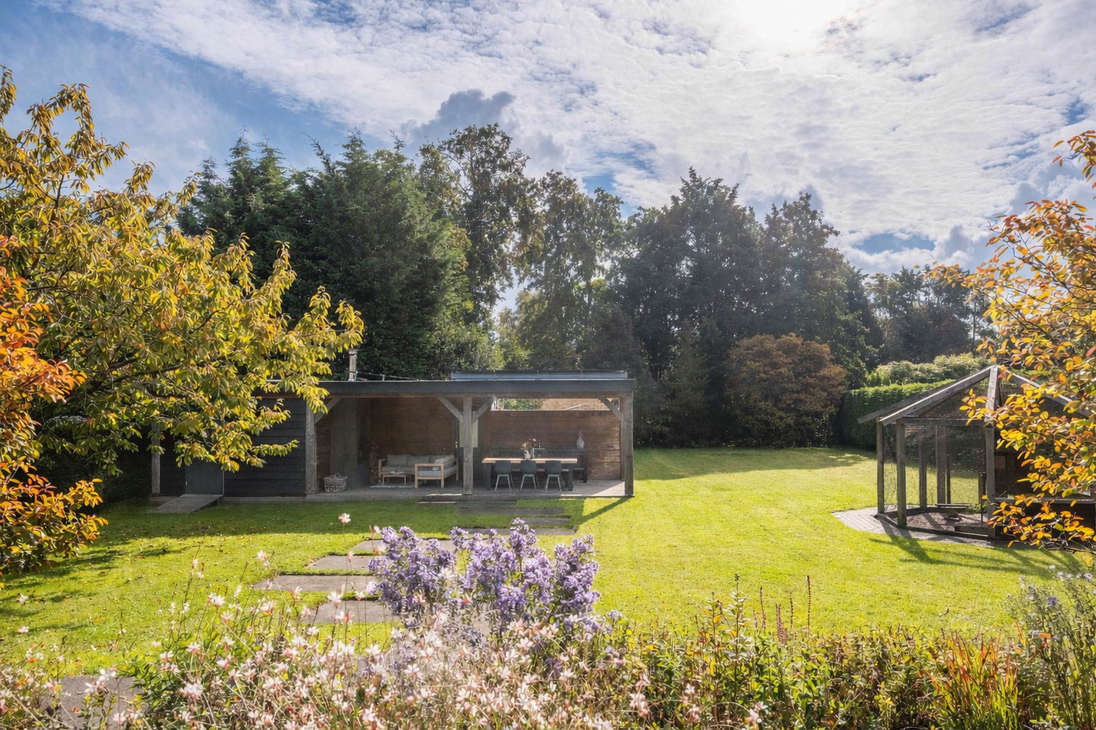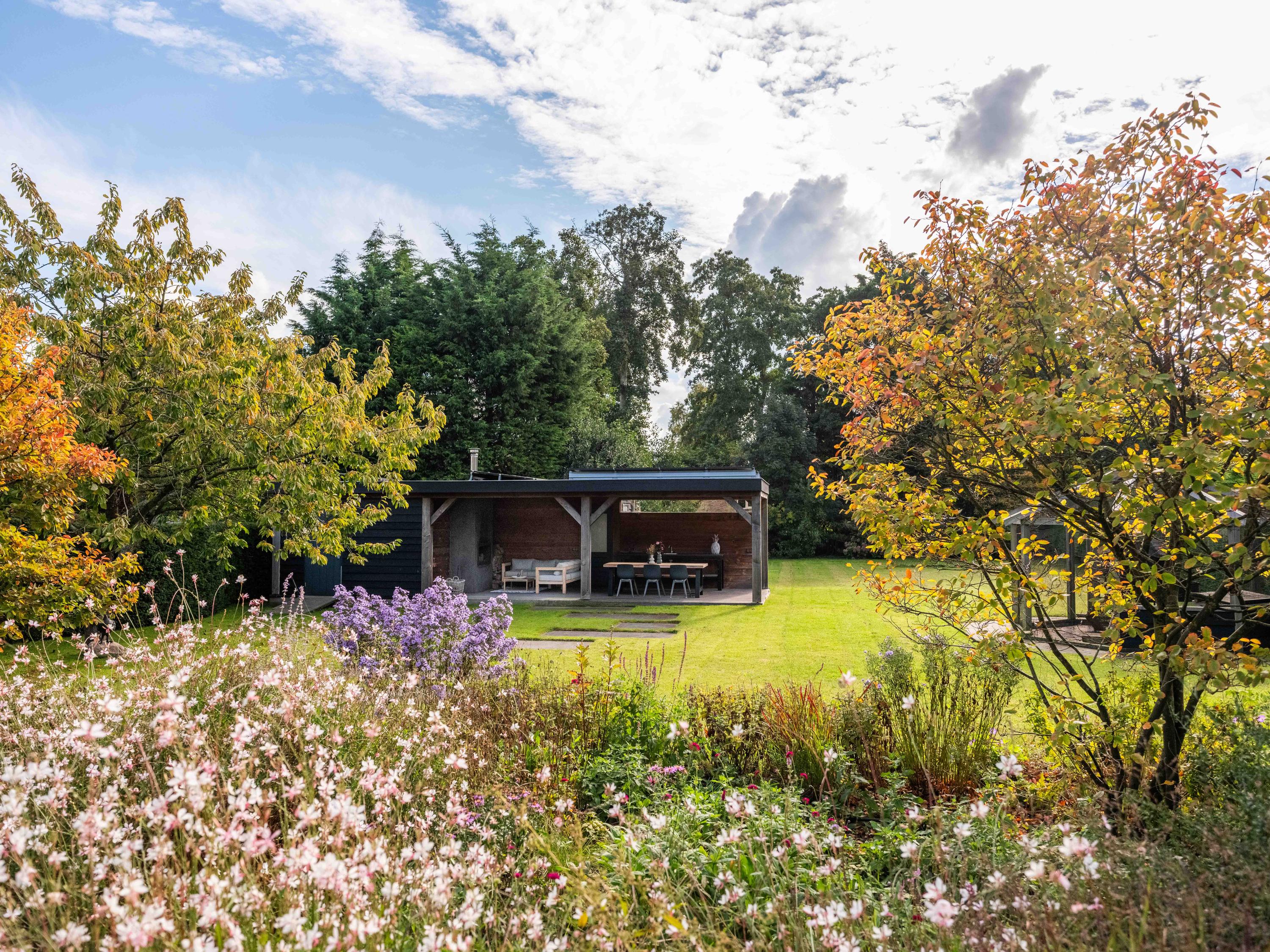 The back garden is very spacious and well landscaped. There is a lovely veranda with a wood-burning stove, seating area, storage space, electricity, lighting and (cold) water. There is also a spacious chicken coop in the garden, which will remain.