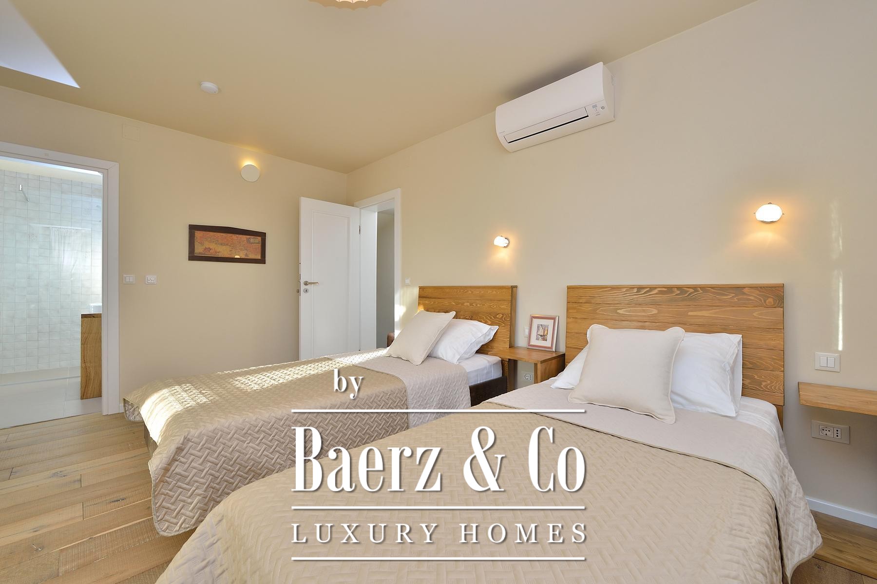 Beyond the villa, a tavern with fireplace, a glass-walled games room opening toward the pool, and a sports court set the rhythm for gatherings and leisure. Every room includes air conditioning, while bathrooms feature underfloor heating. The equipment list includes high-end appliances, video surveillance and a sound system. With only 150 meters to the sea, this stone villa Šibenik promises a discreet lifestyle anchored by privacy, quality and the enduring allure of Mediterranean living.