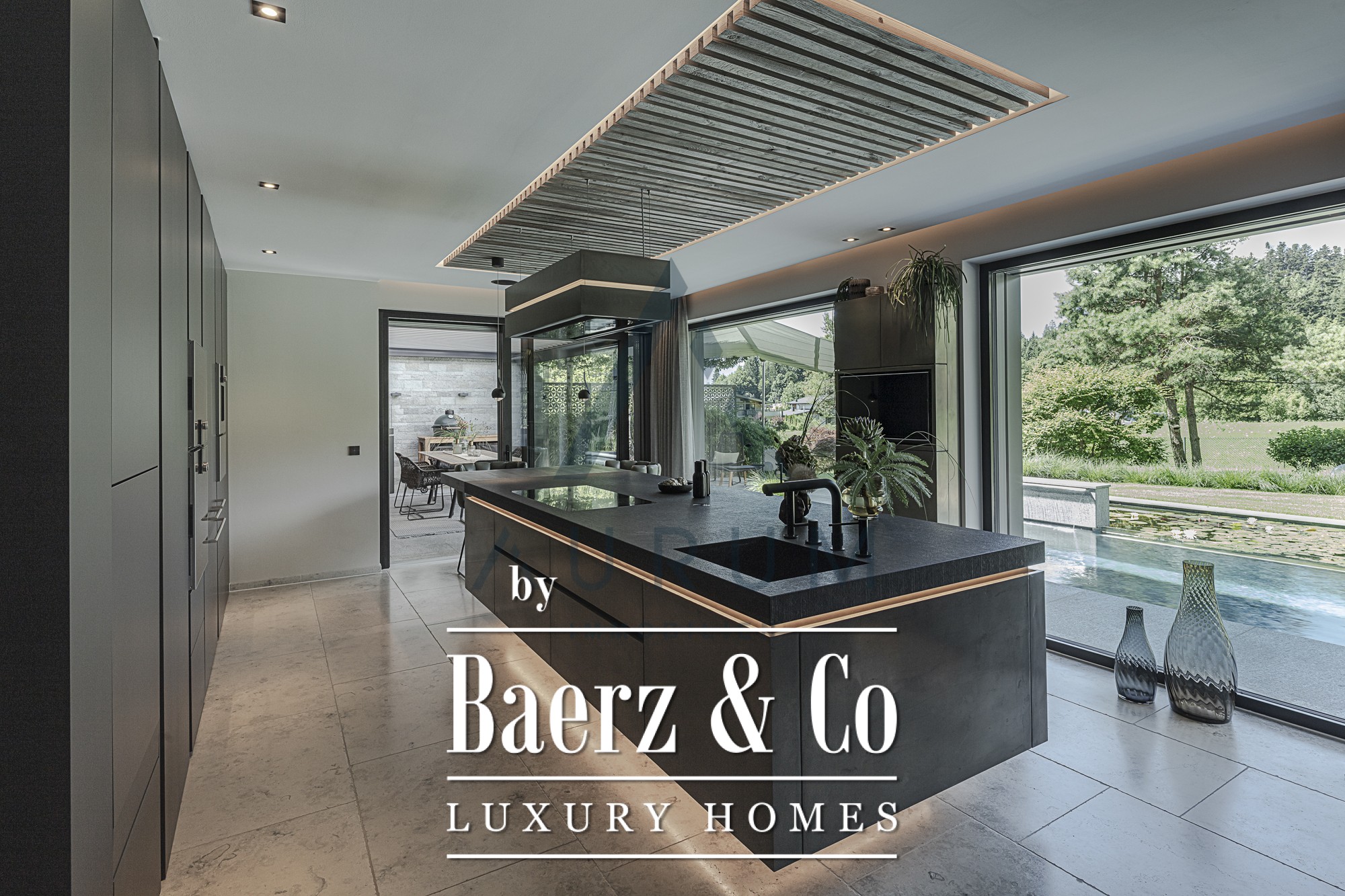 Technical mastery underlies the property’s sustainability and comfort. Geothermal energy, chilled ceilings, and a KNX-controlled ventilation system create a serene and energy-efficient interior. Every material—natural stone, bespoke carpentry, fine fixtures—is curated for timeless quality. The designer kitchen, fitted with Gaggenau appliances, sits at the heart of the home, while the master suite offers a private retreat with a luxurious bathroom and dressing room. Additional highlights include an advanced security system, multi-room SONOS sound, and parking for four vehicles.