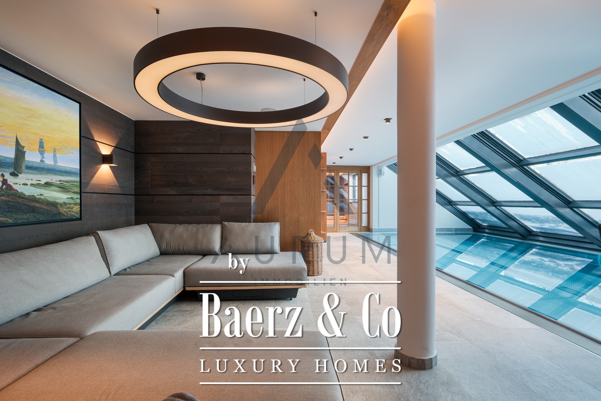 The private wellness area unfolds with an indoor pool, flexible glazing, and a sauna—inviting year-round retreat with views of the mountains. Security and comfort are quietly assured by an alarm system, video surveillance, floor heating, three carports, and additional parking.