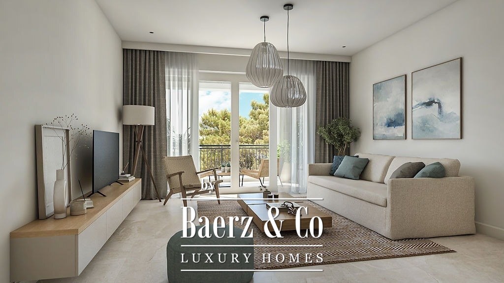 The apartment’s configuration includes an open living room with an integrated kitchen and dining area, a bedroom, a bathroom, and fluid connections to an outdoor terrace and Mediterranean garden that blends lavender and olive. Interiors are defined by understated palettes, floor-to-ceiling wardrobes, and Nolte kitchens with integrated appliances, while custom fitted furnishings, video-enabled entry, underfloor heating in the bathroom, and a wind free air conditioning system reveal careful attention to comfort.