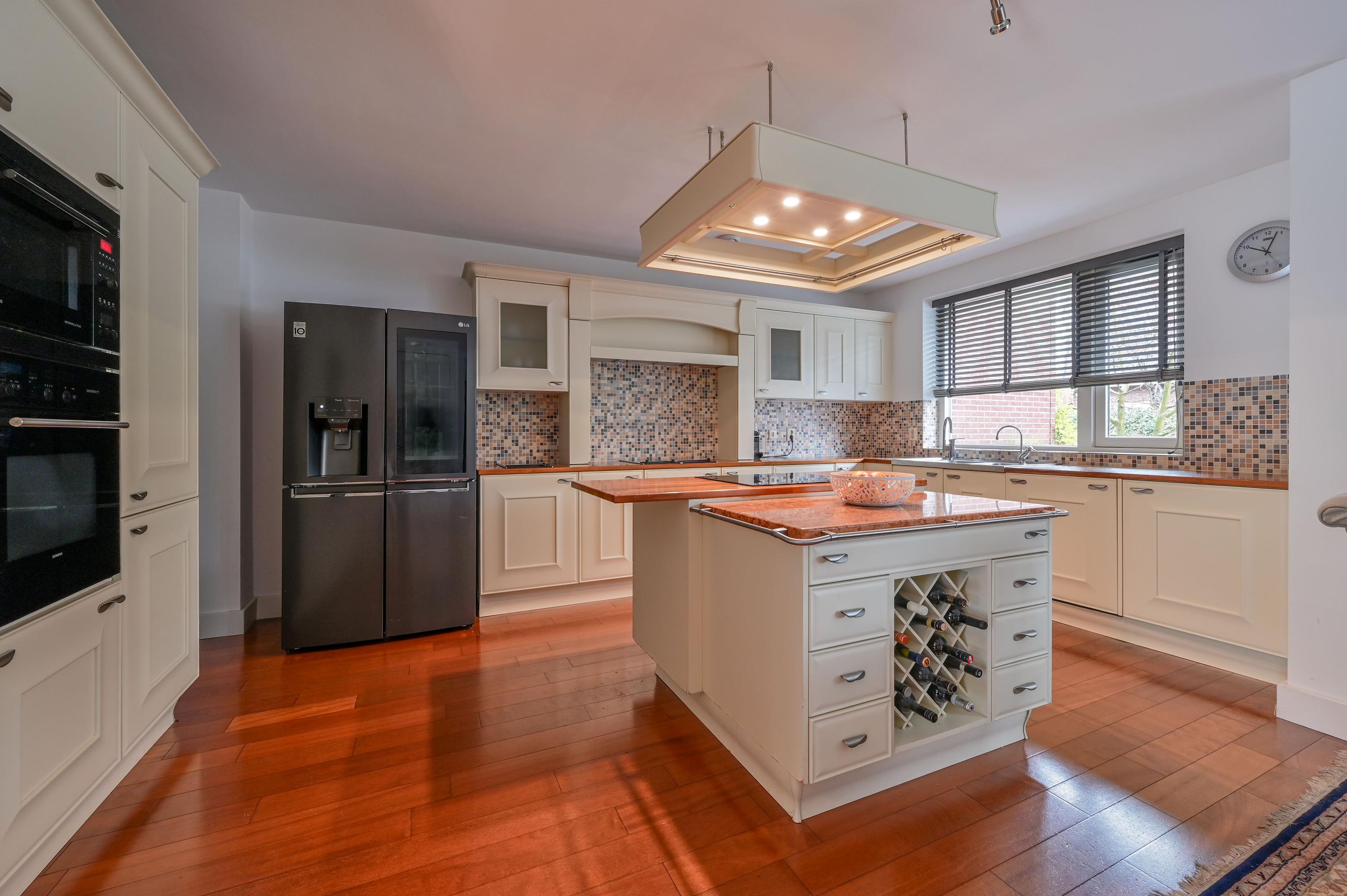 The kitchen at the front is bright and spacious, with large windows and a corner window at the dining area fitted with charming shutters – an ideal spot for cozy meals. The country-style kitchen features a central island with an induction hob and practical drawers on both sides, complemented by an elegant wine rack. The L-shaped countertop provides ample space and is equipped with luxury built-in appliances, including a grill plate, fryer with extractor hood, and built-in food processor. At the window side, there is the sink area with a double sink, Quooker, and dishwasher. A large cabinet wall with a combination microwave, additional oven on the other side of the kitchen, and space for a large double fridge/freezer with ice machine (available for takeover) completes the setup. Under the stairs, there is also a convenient cupboard for coats and extra storage.