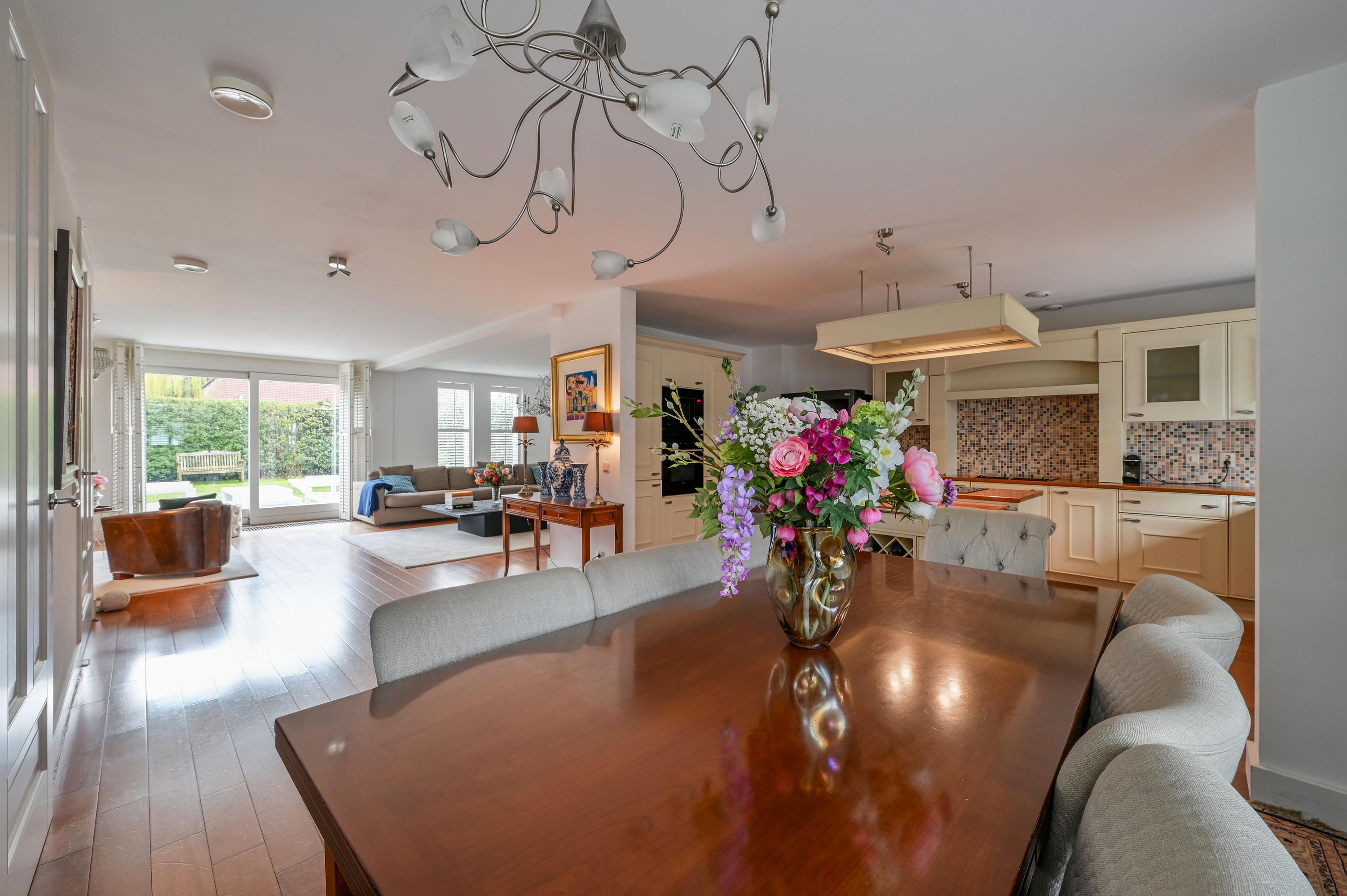 The L-shaped living room at the rear, with a generous seating area, offers beautiful views of the garden and a wide sliding door to the outside. The spacious seating area and a cozy reading corner with a wood-burning stove make it a place to completely unwind. The large side window overlooks the side garden, while shutters, sunscreens, and air conditioning ensure comfort in every season. The entire ground floor is finished with a warm, luxurious wooden floor.