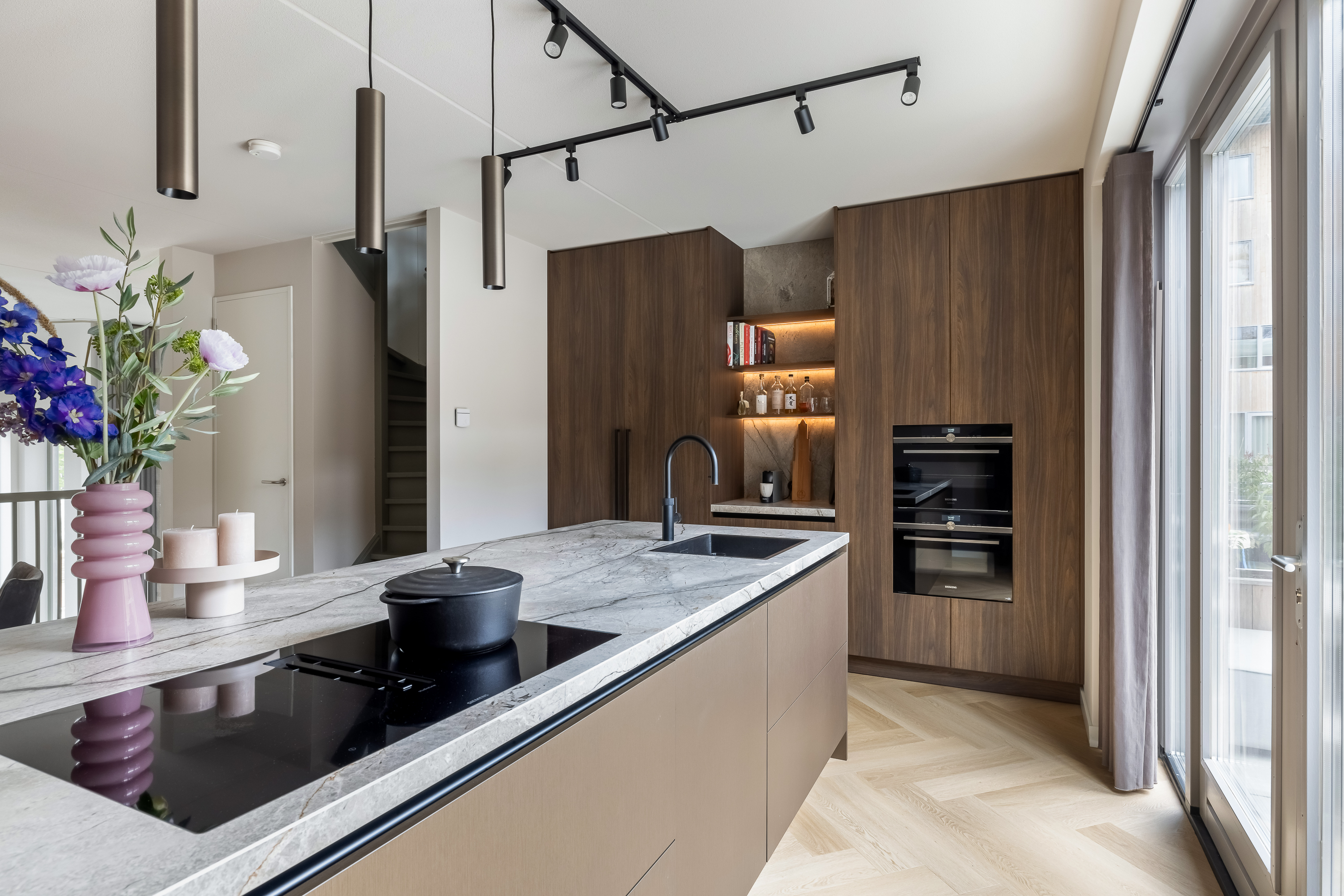 De woning is tot in detail ontworpen. Warm, luxe en eigentijds, zonder koel of afstandelijk te worden. De maatwerkkeuken is een echte leefkeuken. Kasten tot aan het plafond, mooie materialen en goede inbouwapparatuur die met wifi te bedienen is. Je zet de oven alvast aan onderweg naar huis, laat de broodjes bakken voordat je beneden komt en schuift daarna meteen aan om samen te eten. Alles is strak uitgelijnd, nergens standaard, alles klopt. Dit is een huis voor mensen die oog hebben voor detail.