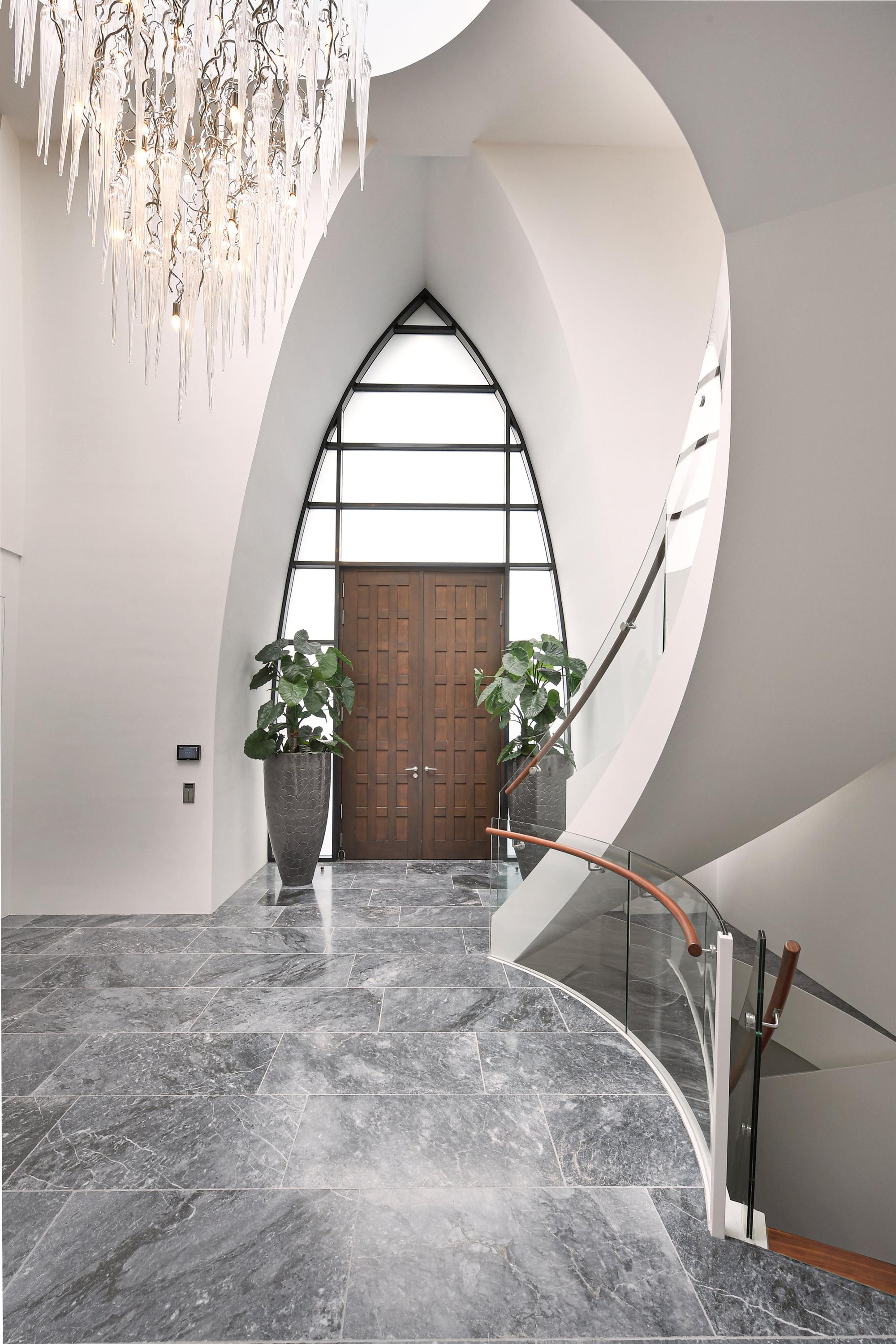The grand entrance hall with sweeping staircase and high double doors immediately conveys a sense of openness and calm.