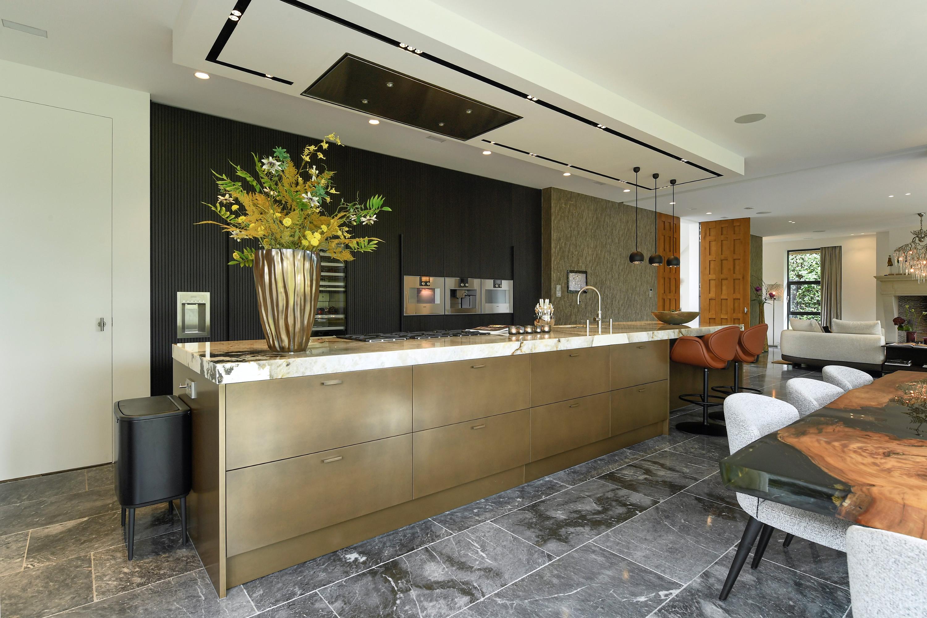 The luxury kitchen, centred around a stunning Patagonia quartzite island, is fully equipped with Gaggenau appliances.