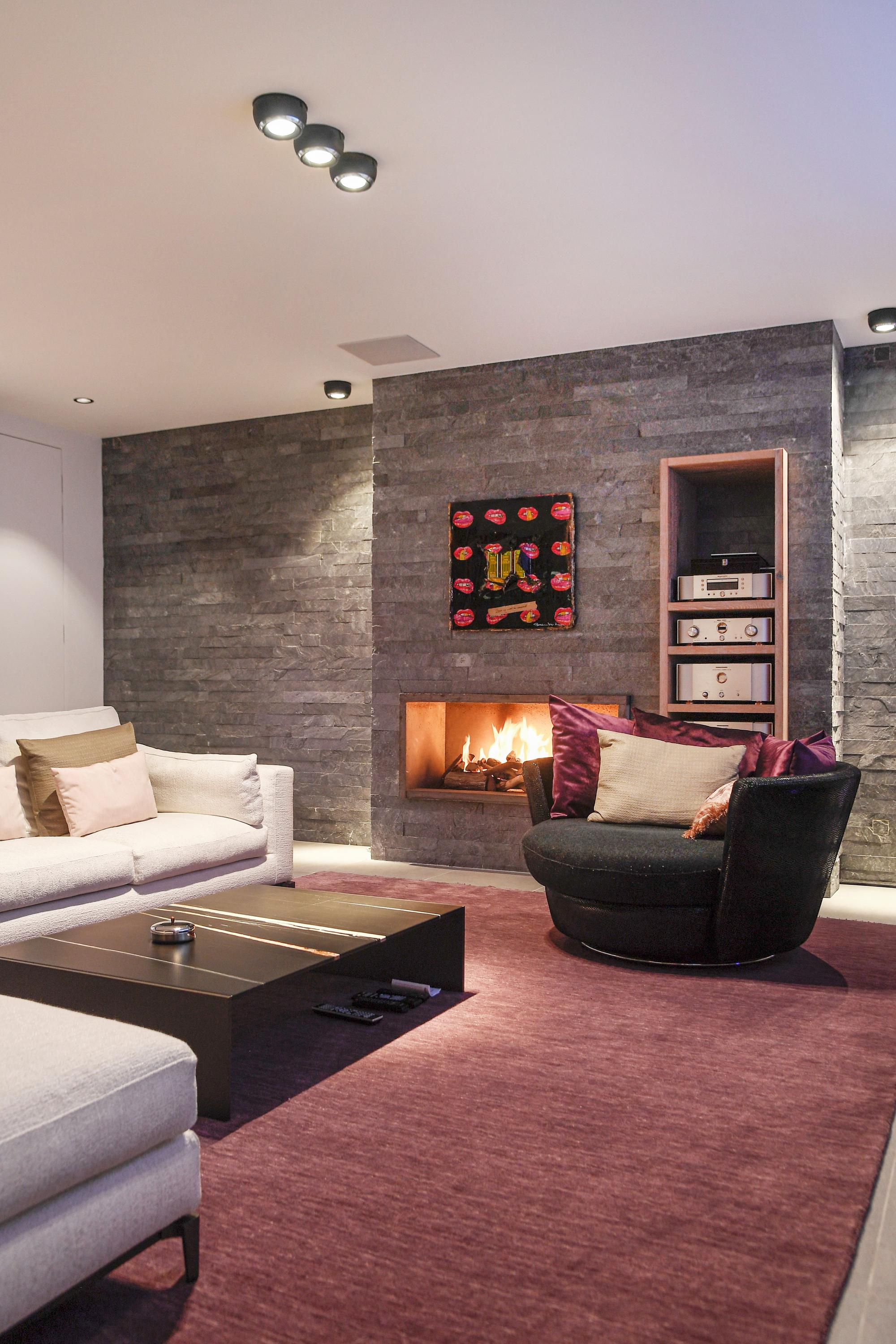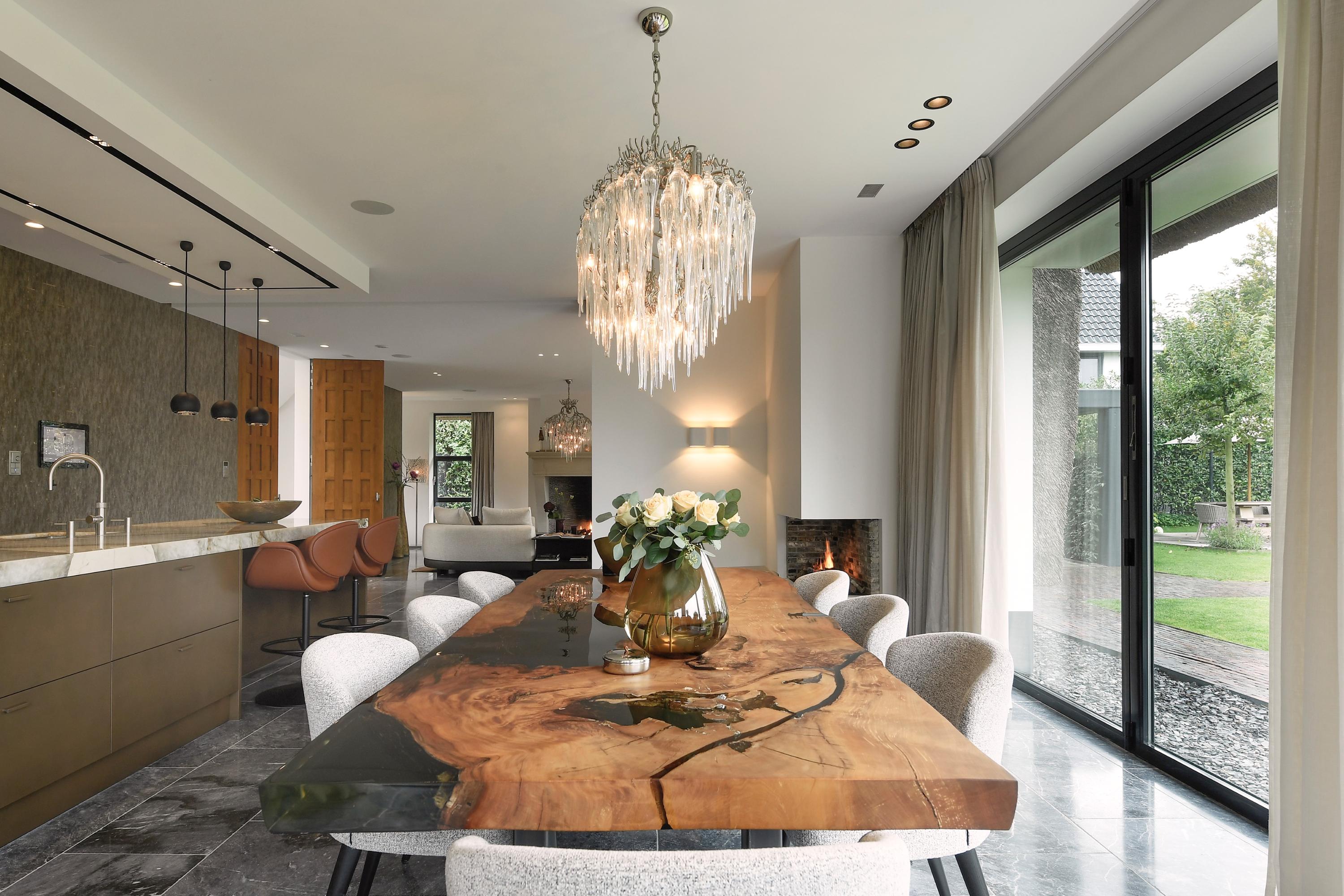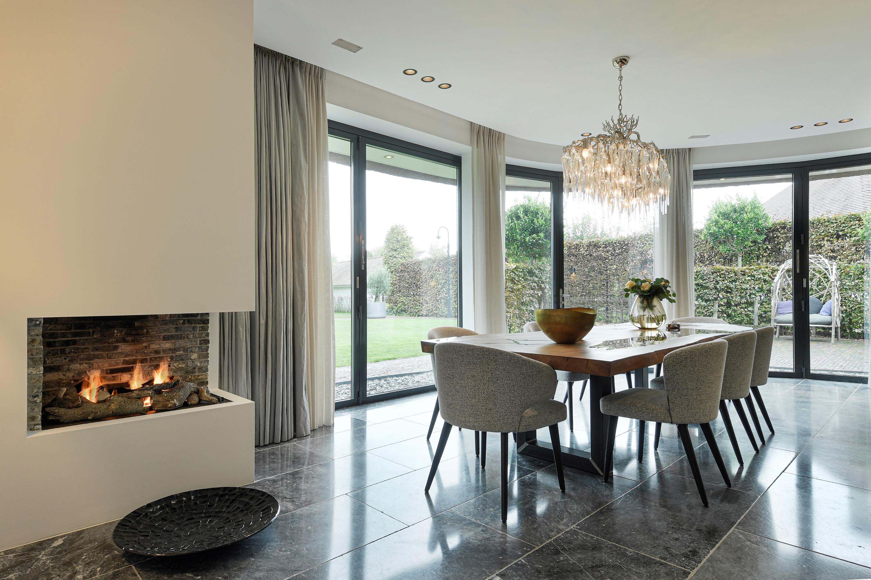 The spacious living room, with its elegant fireplace and floor-to-ceiling windows, flows naturally into the garden and terraces.