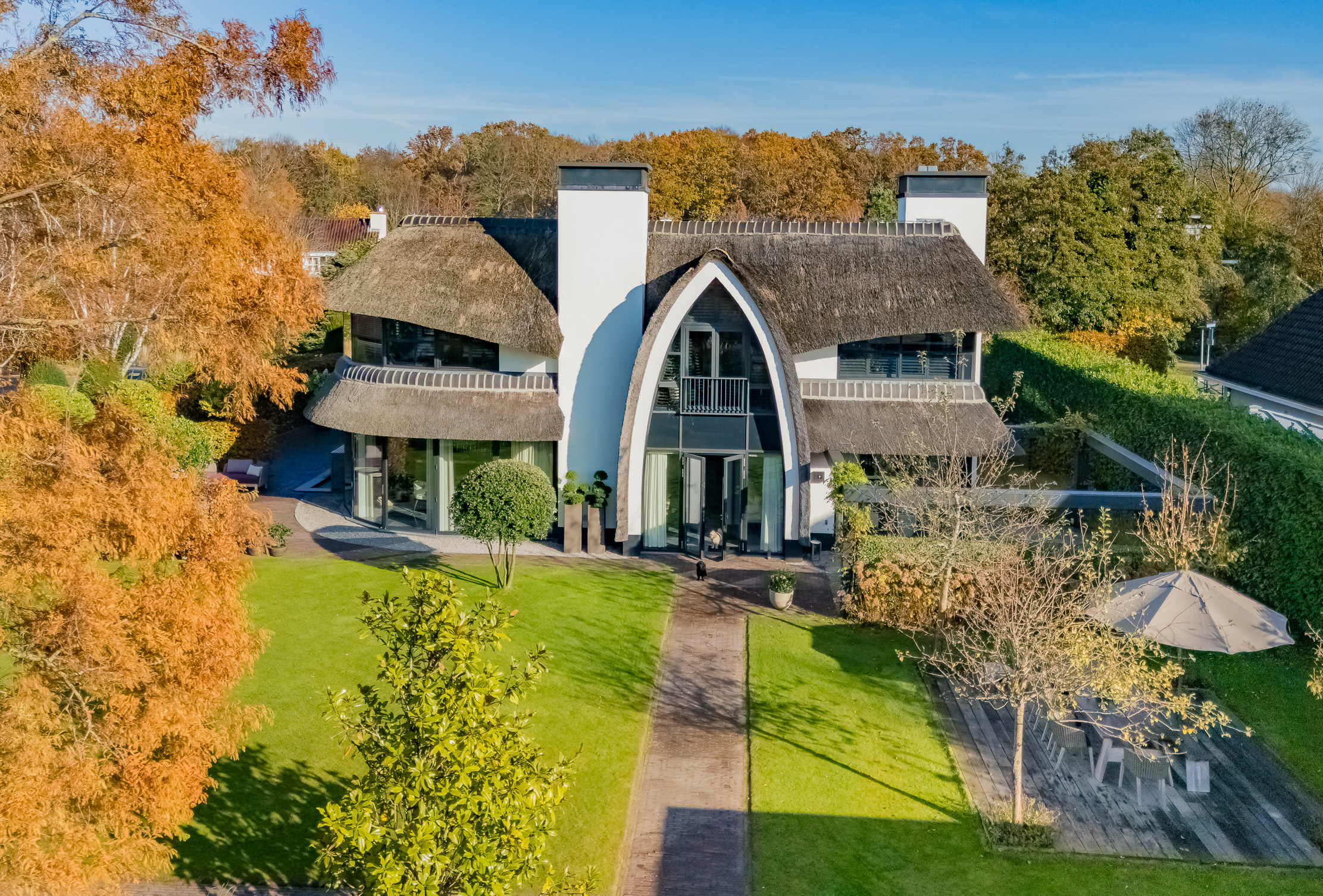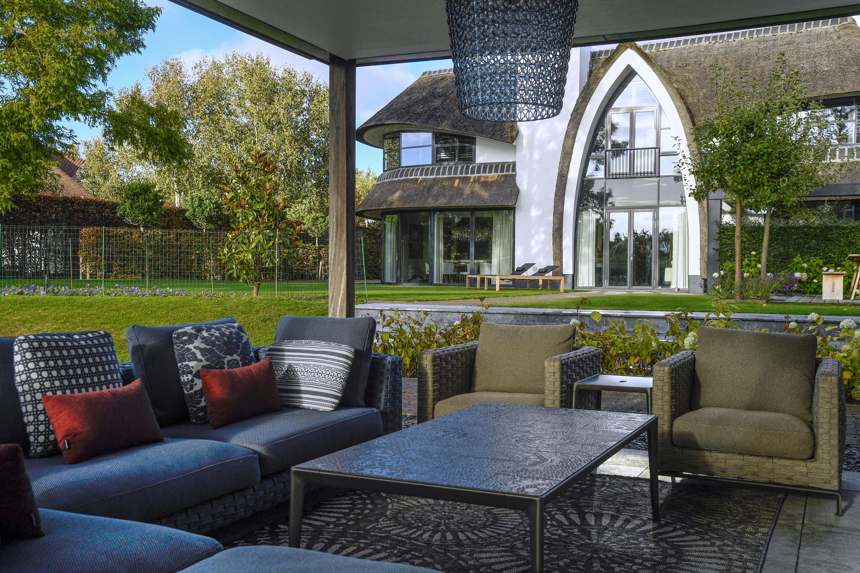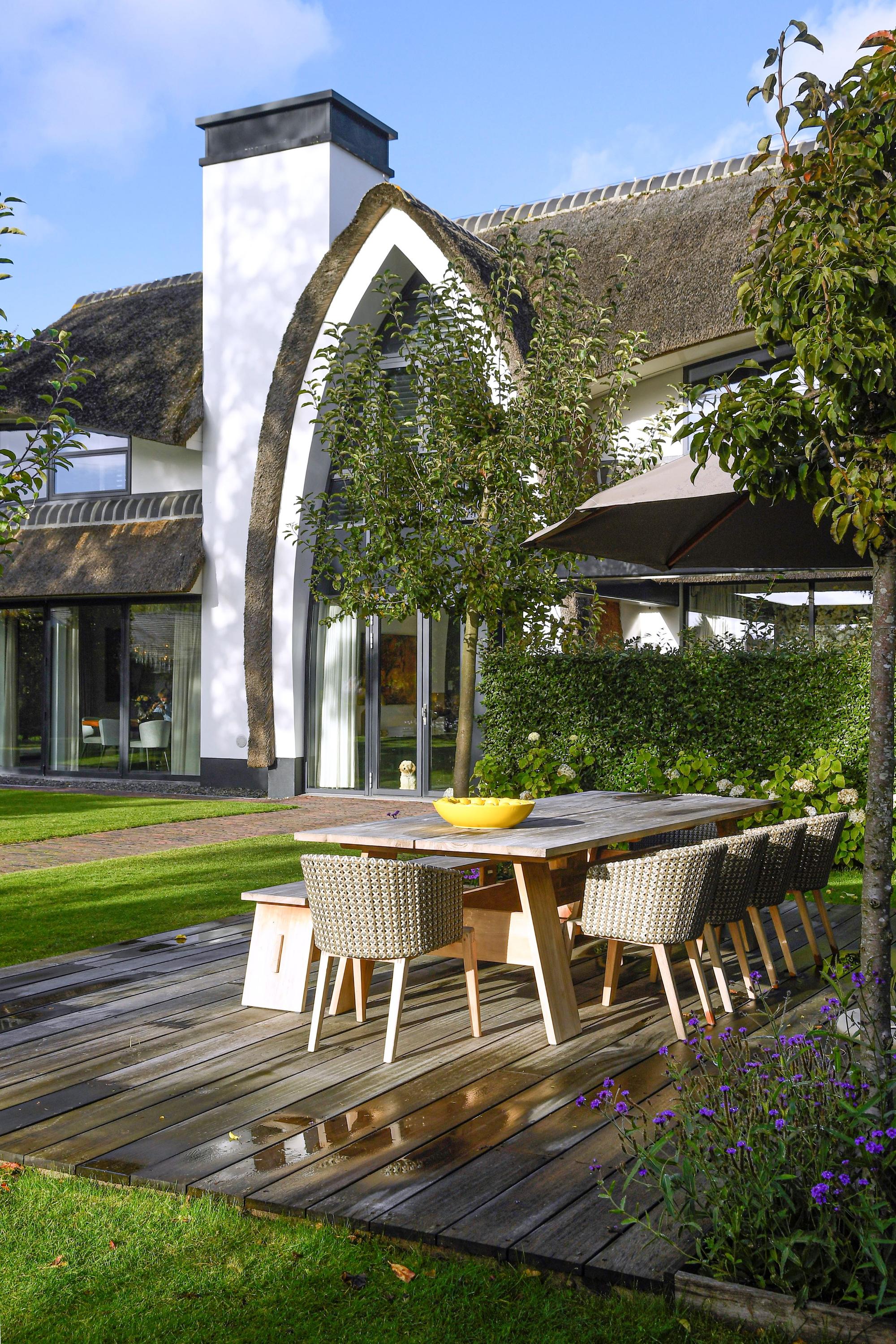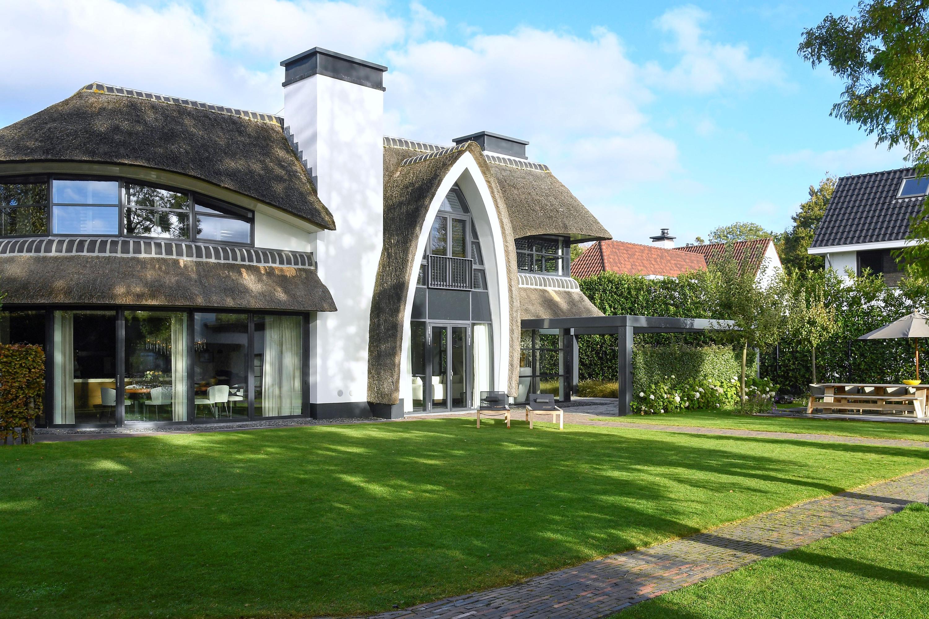 With its thatched roof, sculptural lines, and remarkable waterside position, this villa is a true landmark in the region — designed by Van Manen Architects, known for their timeless and elegant style.