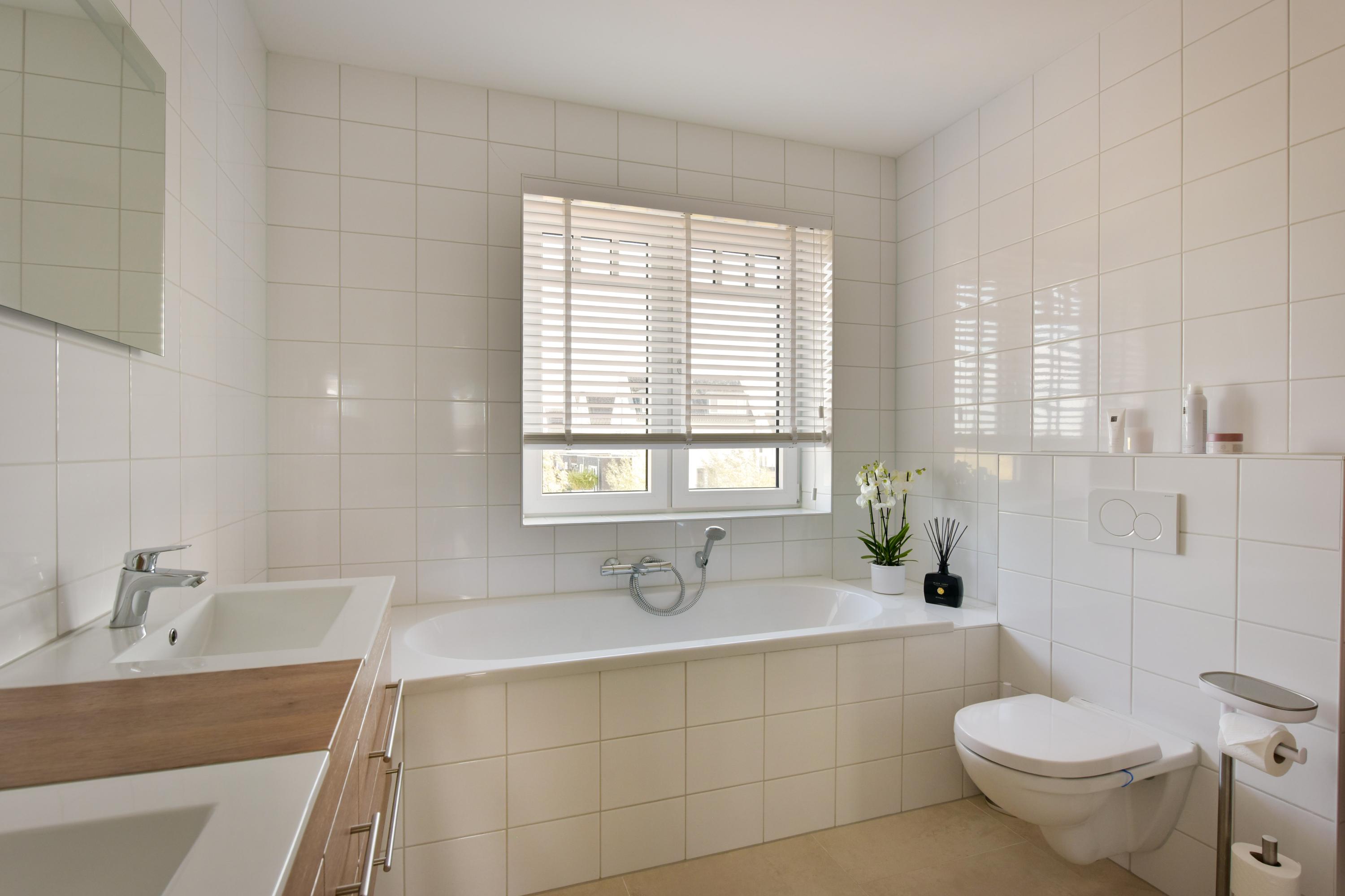 The bathroom feels like a luxury spa, with a large walk-in shower with glass door, a relaxing bathtub, a modern double vanity with heated and illuminated mirror, and a toilet. The high-quality tiling aligns with the style of the ground floor. The entire first floor features a PVC floor with underfloor heating, and most windows are fitted with screens.