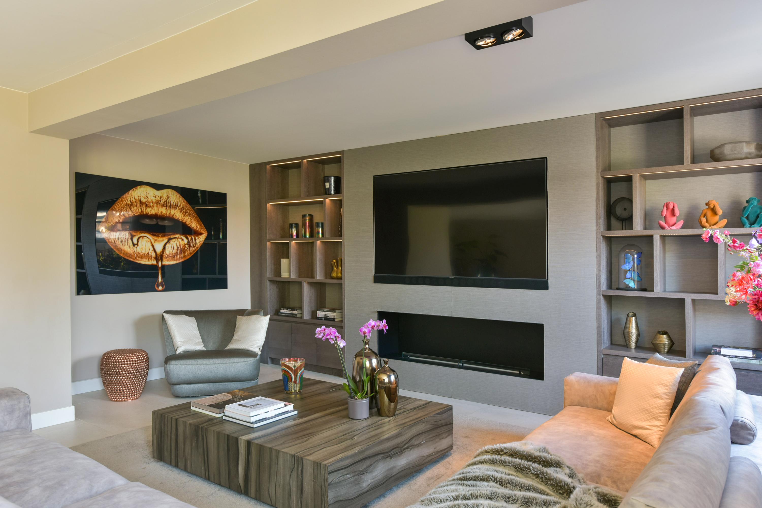 Opening this door reveals an impressively spacious and bright living room. Thanks to the extension at the rear—without a supporting column—the space feels completely open and uninterrupted. The custom-designed wall unit facing the garden perfectly combines design and functionality, with open shelves, concealed storage, a dedicated space for the TV, and a cozy bio-ethanol fireplace. All designed by Eric Kuster, whose style embodies cosmopolitan luxury, a balance of glamour and comfort, with rich materials, subtle color palettes, and layered textures, creating interiors as elegant as they are inviting, like a luxury hotel suite.