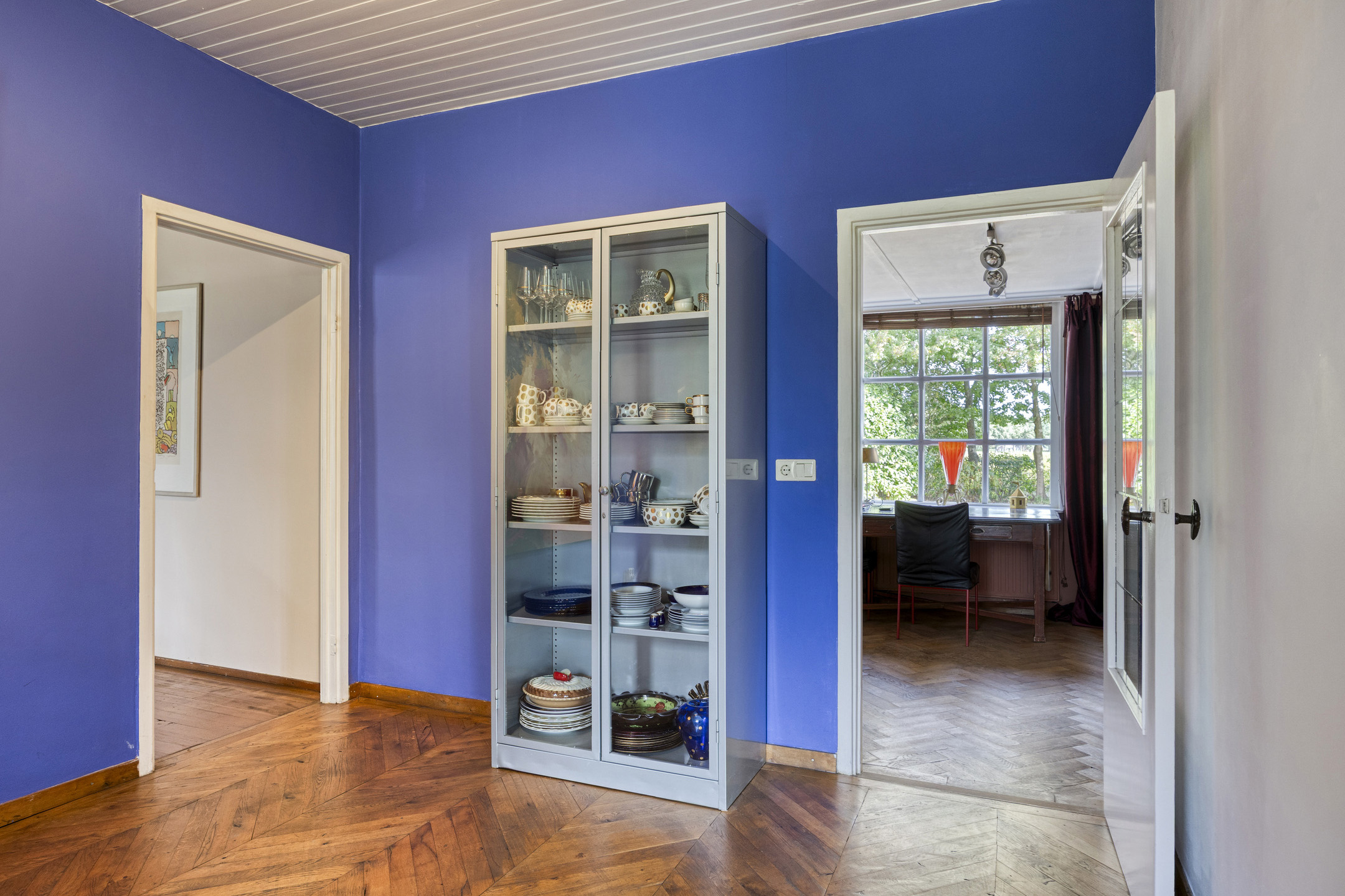 Intermediate room currently used as an office; plastered walls, herringbone floor, ceiling finished with board panels;